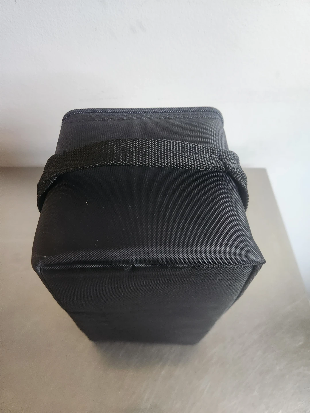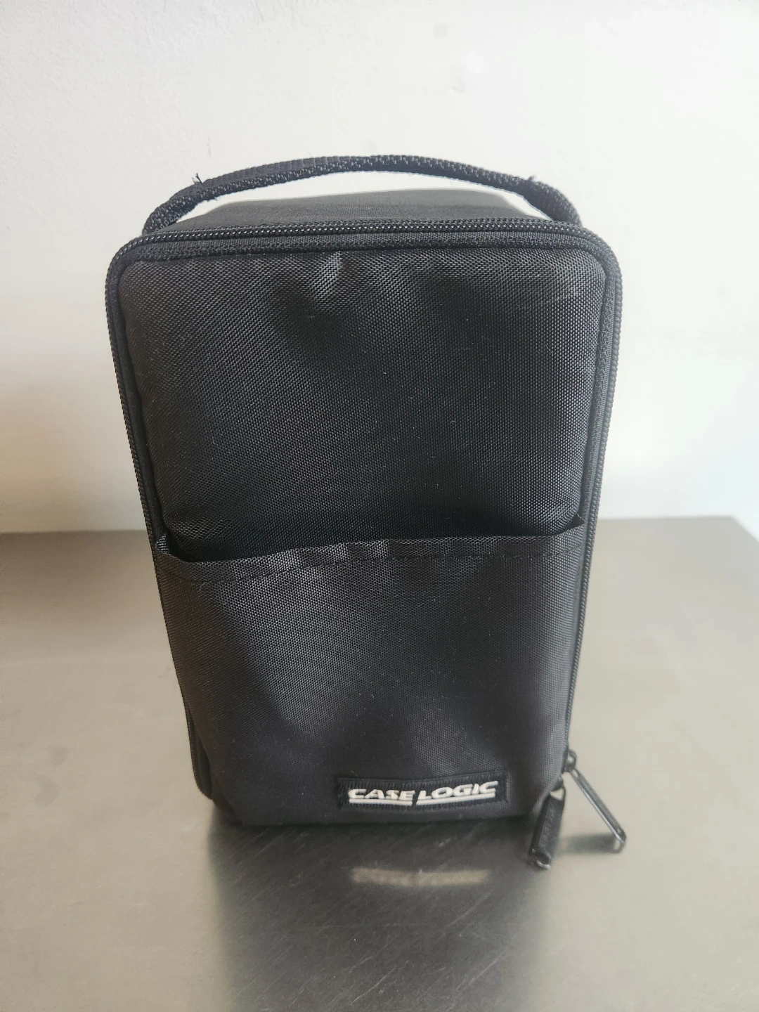 Black Case Logic carrying case with a front pocket and zippered closure. It has a nylon exterior and a fabric handle. Great for storing small electronics or accessories!