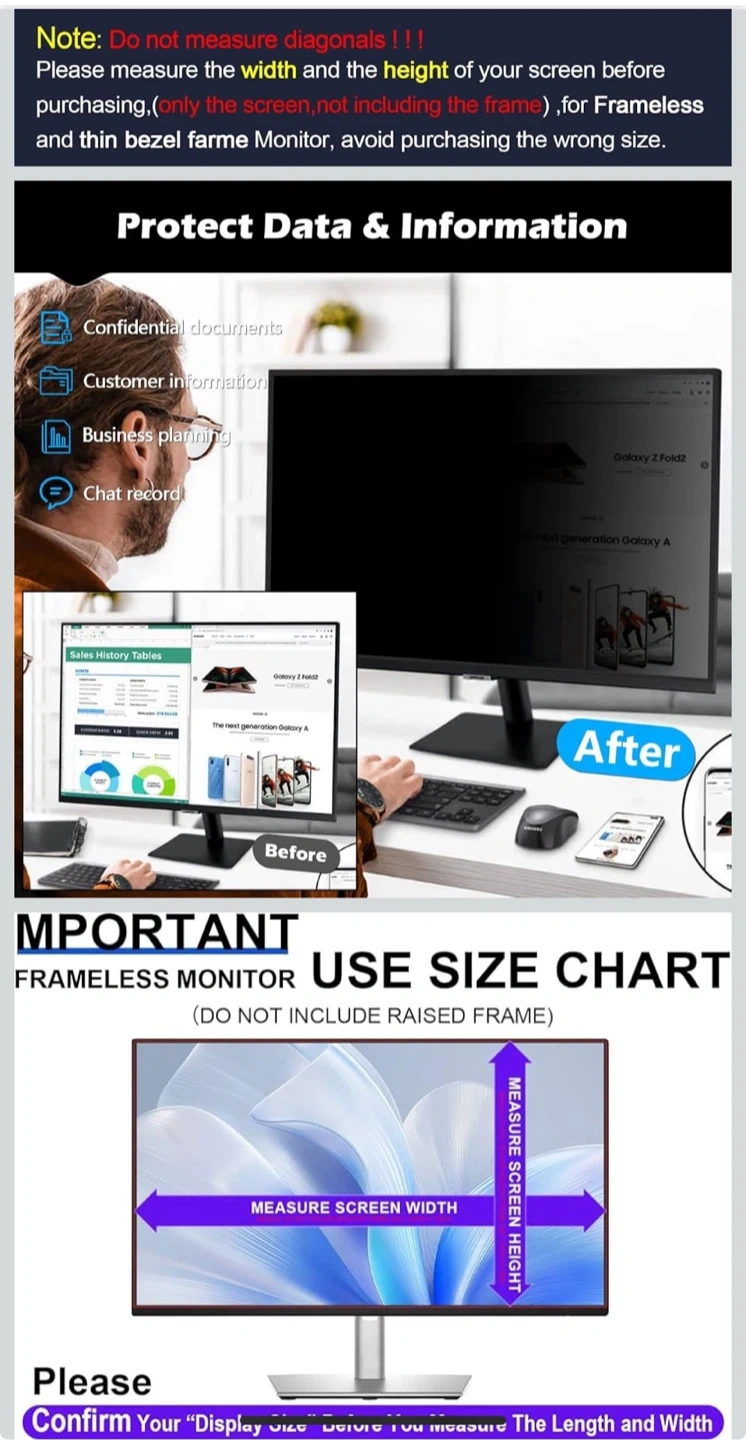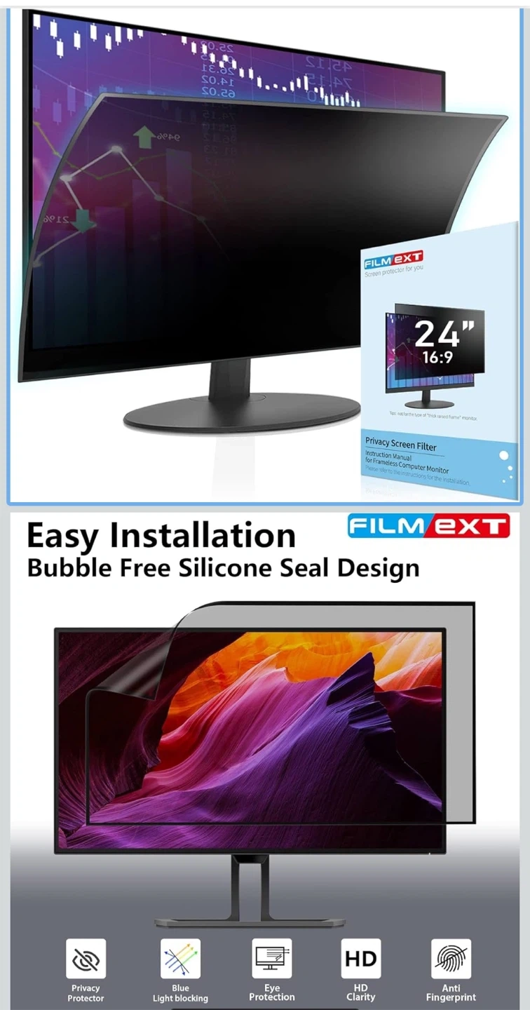 This FILM EXT premium screen protector is designed for 24-inch monitors with a 16:9 aspect ratio. It offers privacy protection, blue light blocking, and HD clarity. Installation is bubble-free with a silicone seal design. Includes privacy screen protector, alcohol prep pad, dust removal stickers, and cleaning cloth.