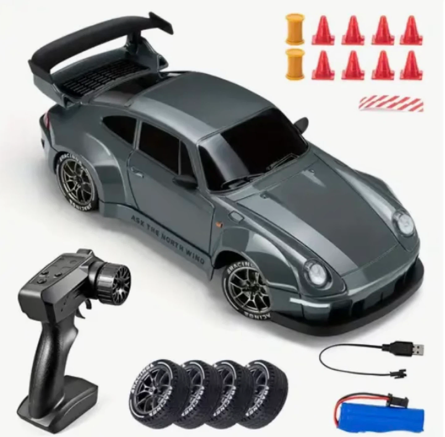 This Dirft RC car is a 1:24 scale model. It's a 4-wheel drive with LED lights and a digital proportional throttle. It comes with a remote control, extra tires, charging cable, and battery.