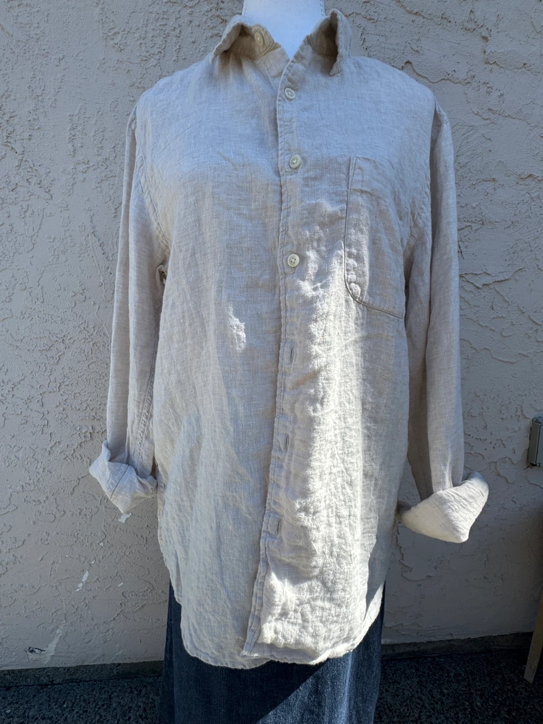 A casual button-up shirt made from breathable linen. It features a collared neckline and a single chest pocket. This shirt's relaxed fit makes it comfortable for warmer days.