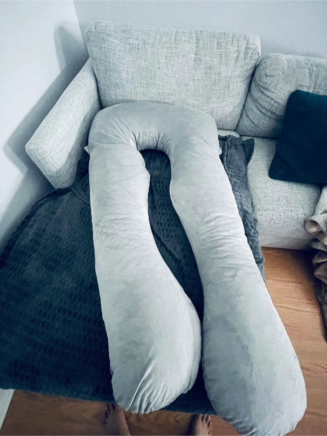 This U shape pregnancy pillow is designed for full body support. It's made with memory foam and has a removable velvet cover. This pillow is great for sleeping and maternity comfort. Recently purchased 2 weeks ago, only used once.