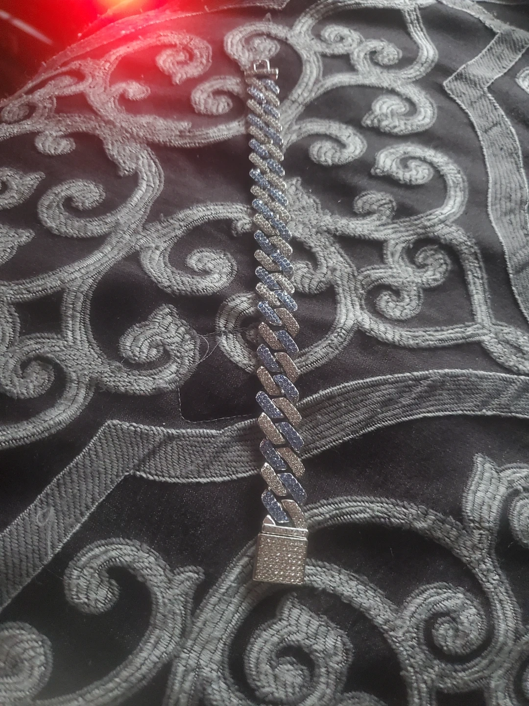 This bracelet features a Cuban link design with alternating blue and silver-coloured stones. It has a secure clasp closure. It's a stylish accessory for any outfit!
