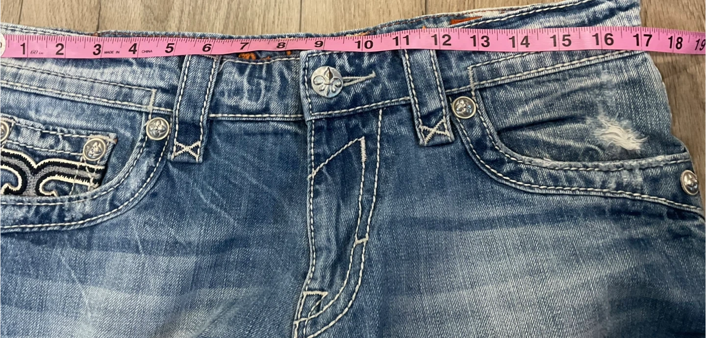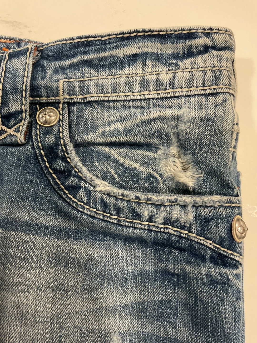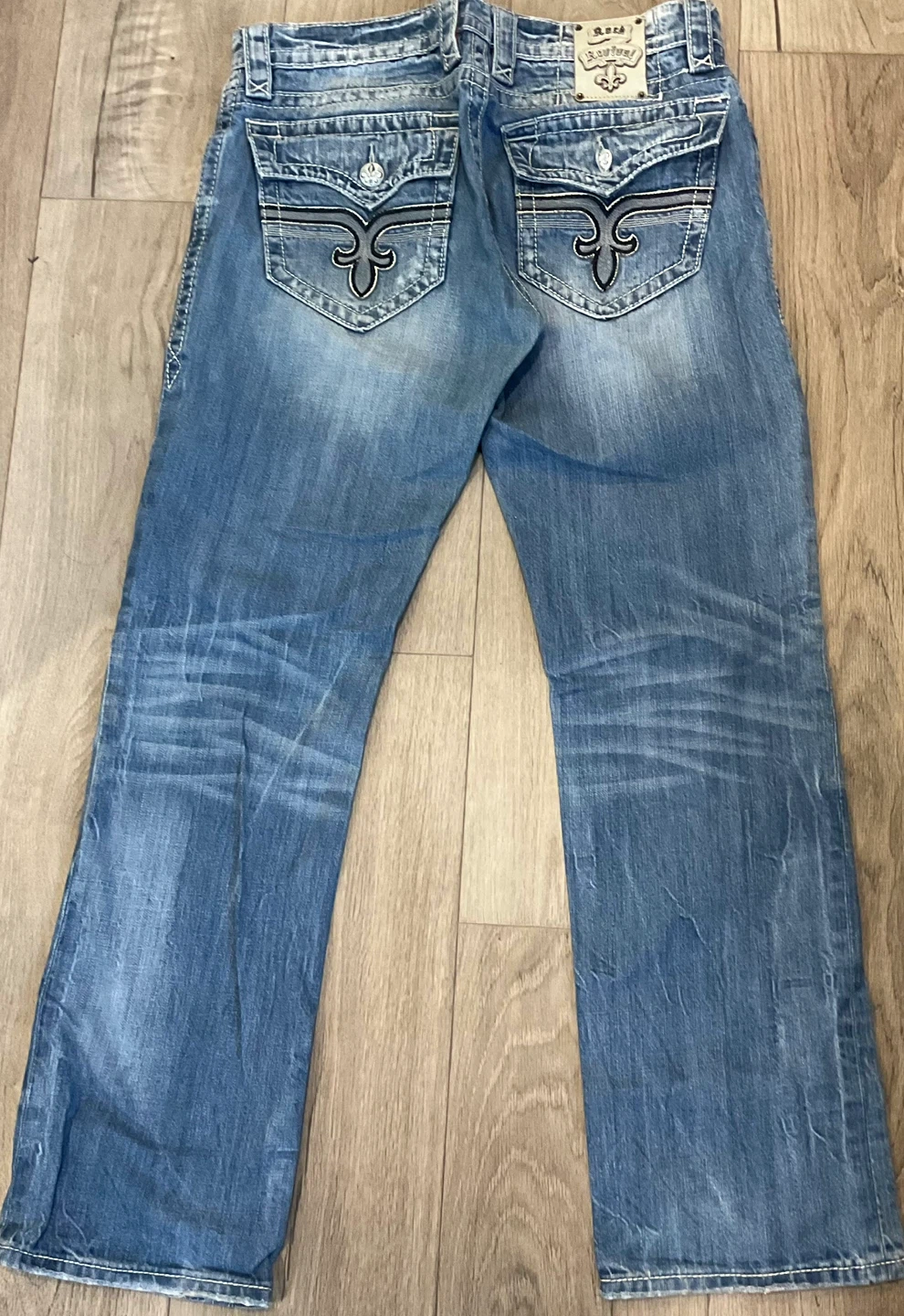 These are Rock Revival John Straight denim jeans. Size 32. They feature a classic blue wash with some distressing. These jeans offer a straight leg fit.