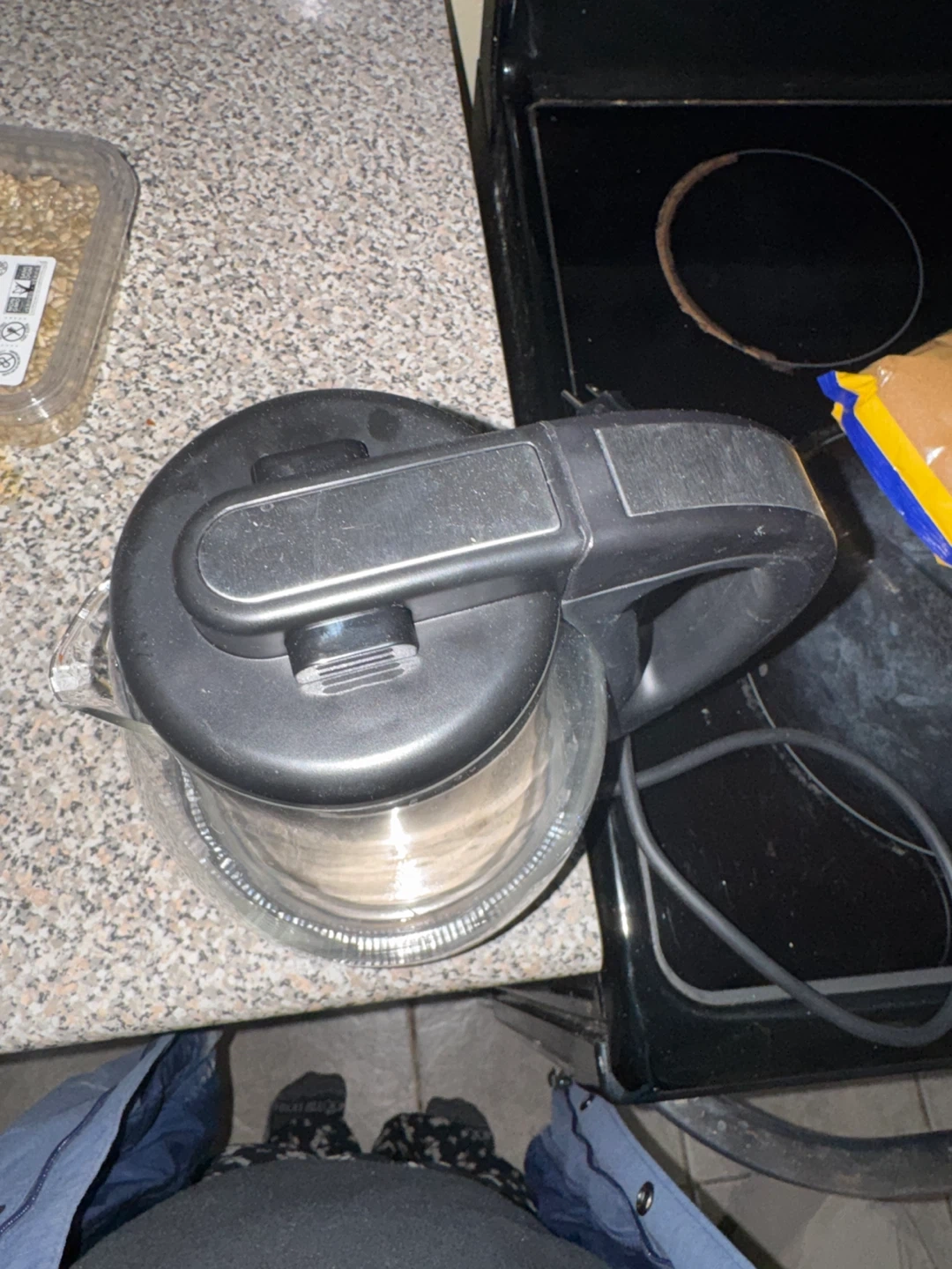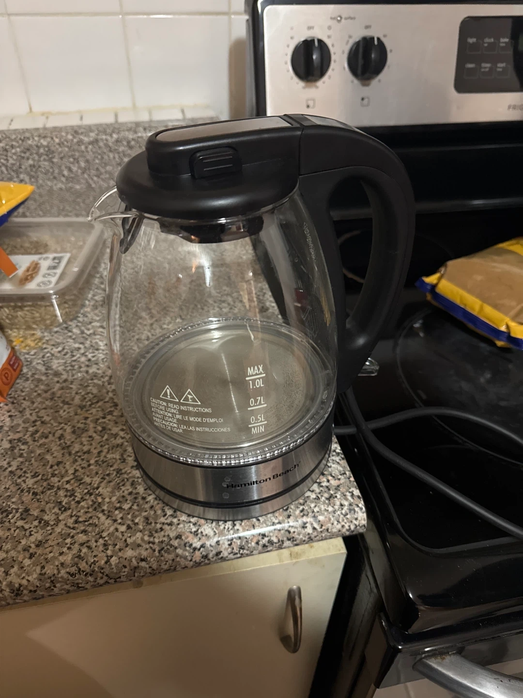 Hamilton Beach electric kettle with a glass body. It has markings for maximum fill at 1.0L, with min fill at 0.5L. This kettle is useful for quickly boiling water for tea or coffee.