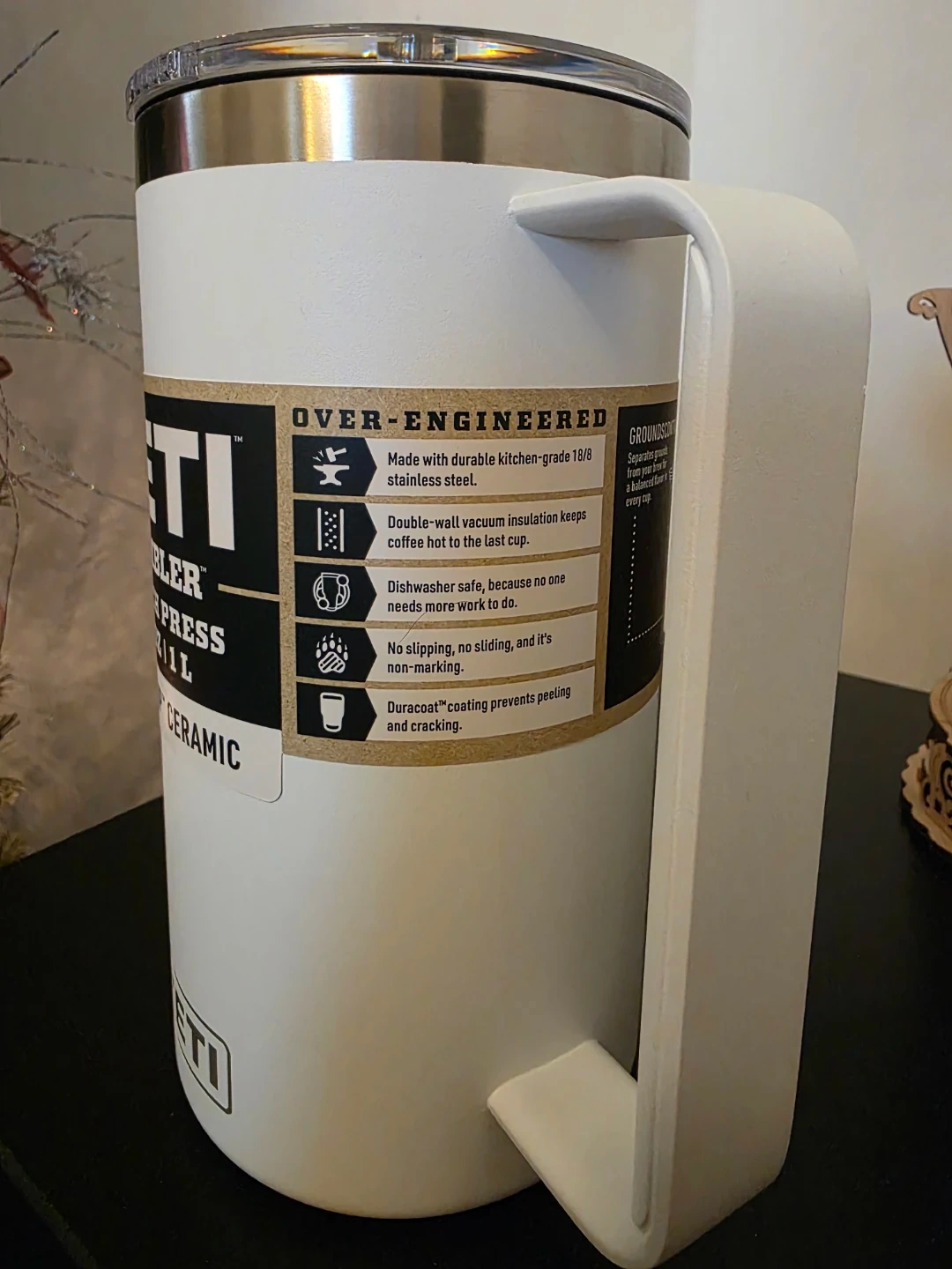 - Double-wall vacuum insulation keeps coffee hot to the last cup