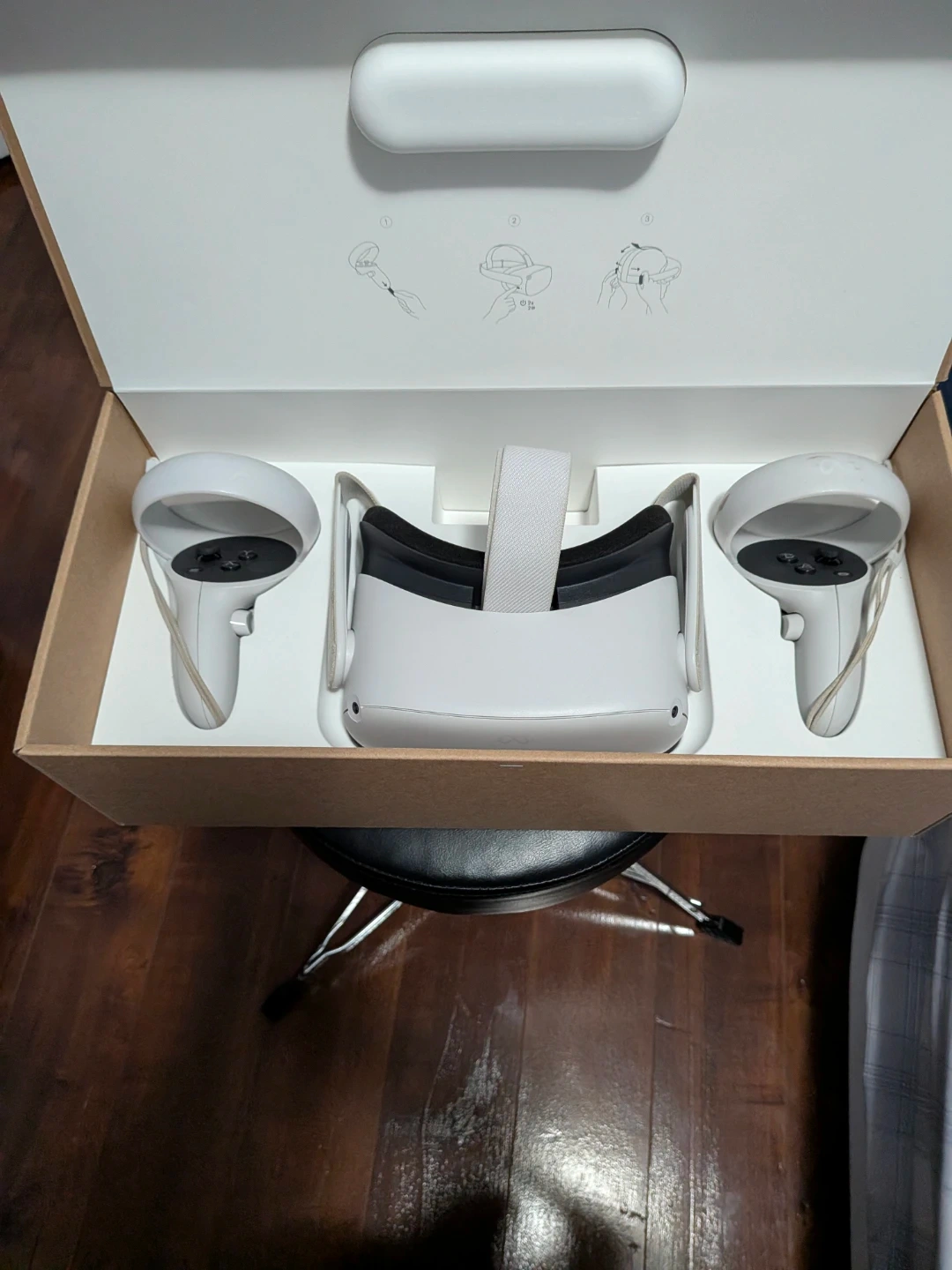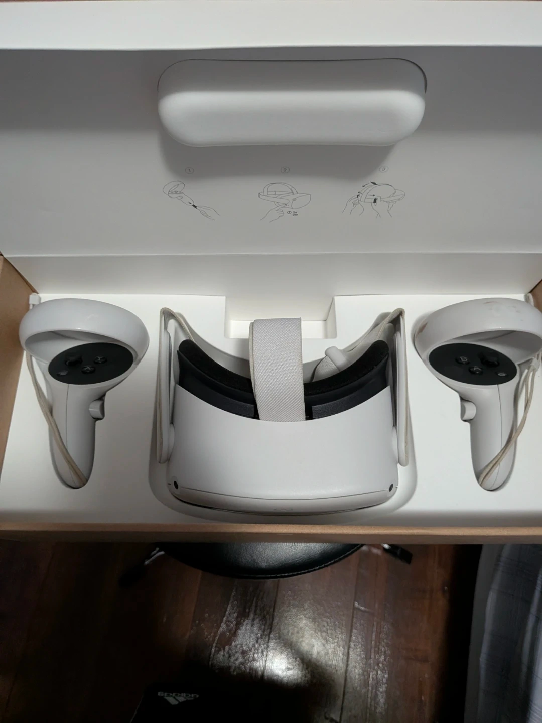 Meta Quest 2 VR headset and controllers with 128GB storage. Comes with original box and packaging. Includes headset, two controllers, and charging accessories.
