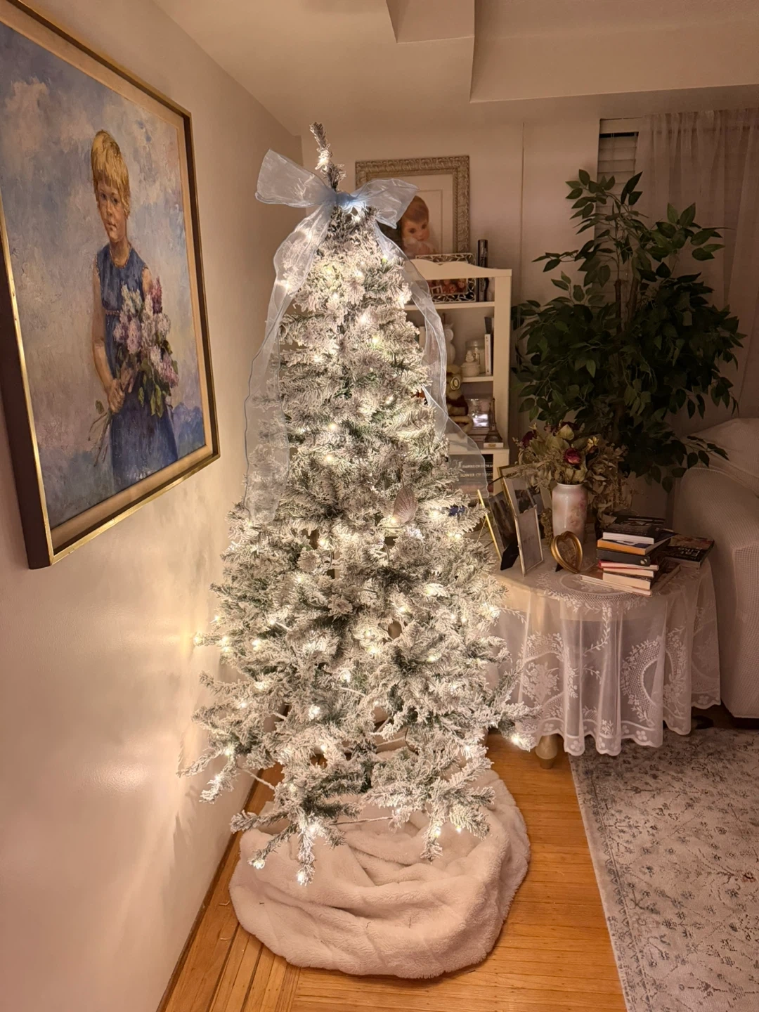 Selling a lovely Christmas tree that's all ready to go! It comes with the lights and so it's super easy to set up and enjoy. Unfortunately selling because my cat (literally in the picture) keeps trying to eat it. Brand new. Just set up for a couple days