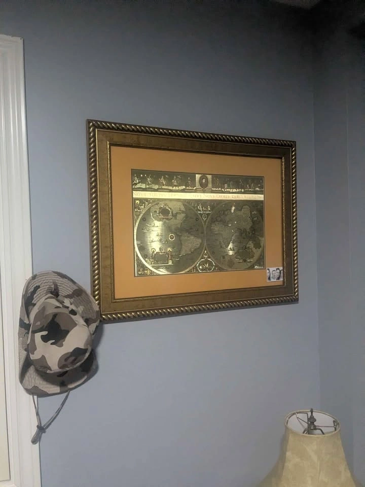 Beautiful, large-scale gold foil reproduction of the famous 1665 world map by Dutch cartographer Willem Blaeu. This is a high-quality vintage piece with stunning detail and a brilliant gold reflective finish. Subject: Map of the World (Nova Totius Terrarum Orbis Geographica ac Hydrographica Tabula). Features ornate illustrations of the four seasons, celestial bodies, and the seven wonders of the ancient world. Excellent vintage condition. The gold foil is intact with no flaking or fading. Comes in a solid, high-quality vintage frame [insert frame color/material here, e.g., dark walnut or ornate gold]. Perfect for an office, library, or as a unique statement piece for your home decor. Price: $175 (OBO). Location: Welland/Port Colborne Area.