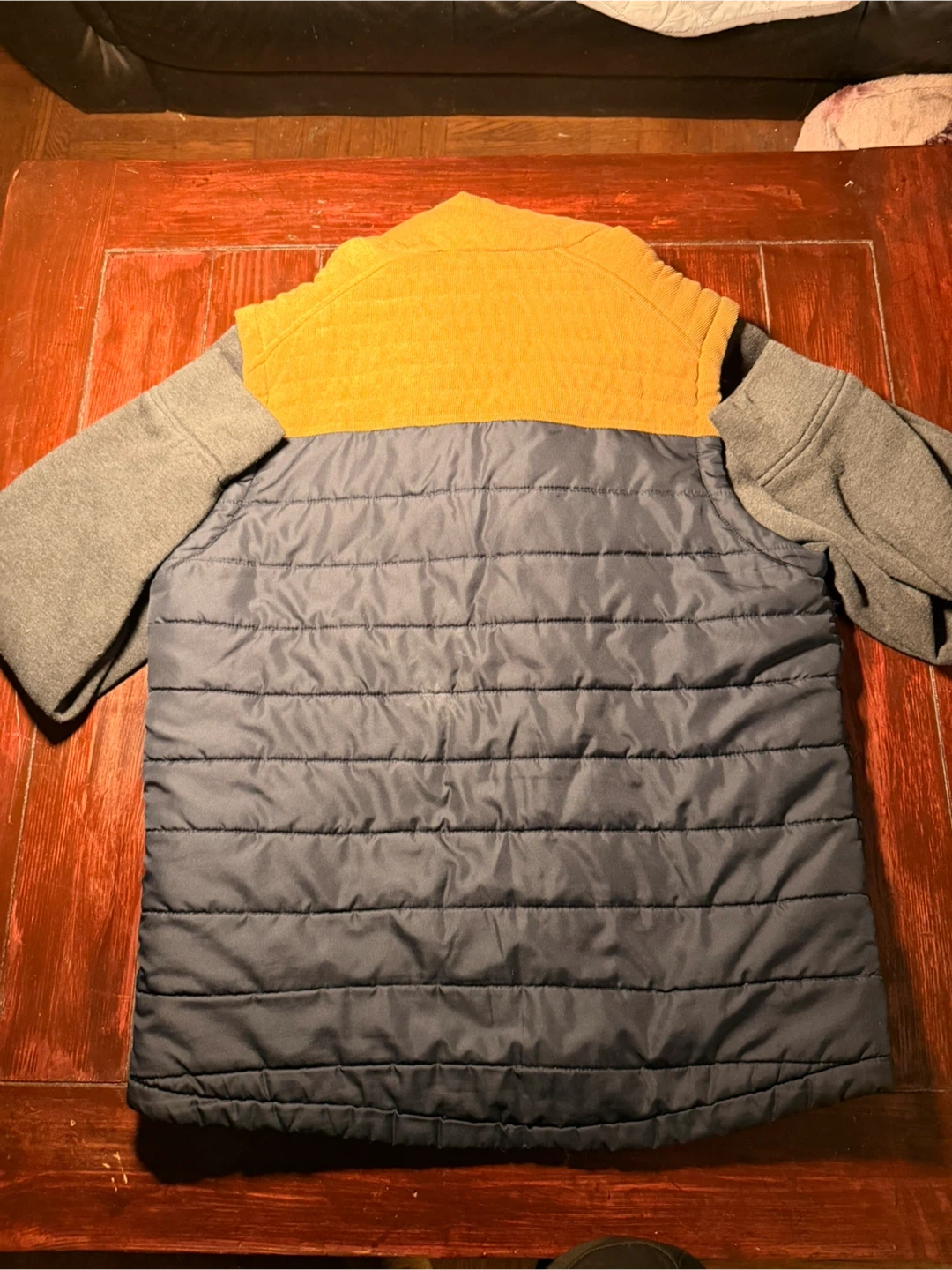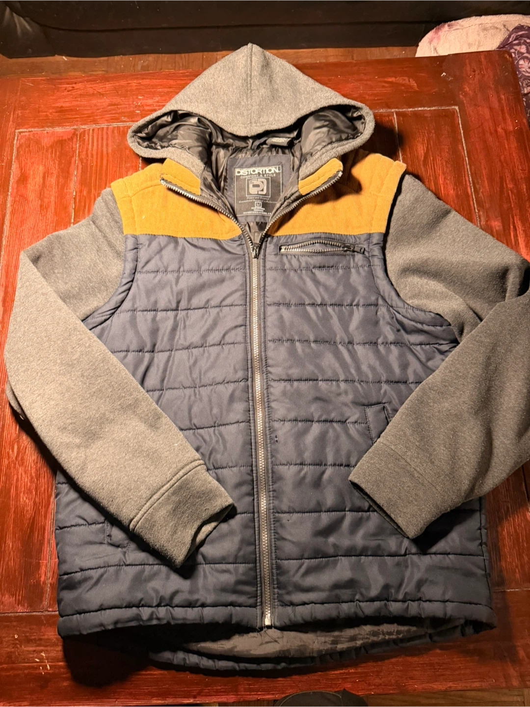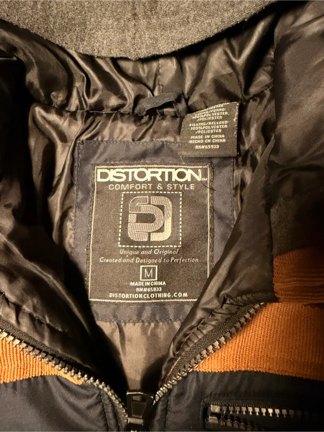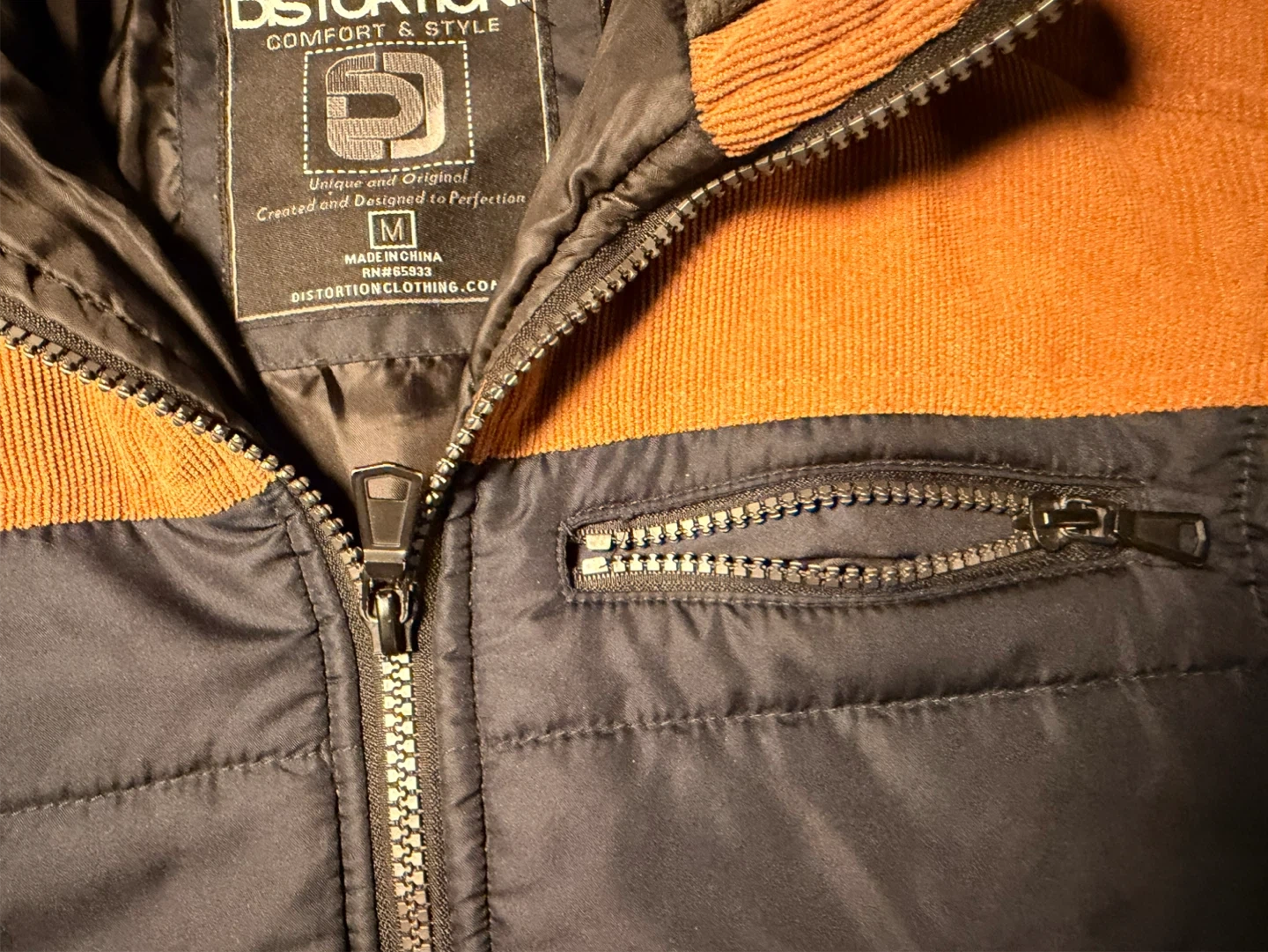 This Distortion jacket features a puffer front and sleeves with a contrasting orange corduroy collar detail. It's a size medium and made in China. The jacket has a full zip front and zippered chest pocket.