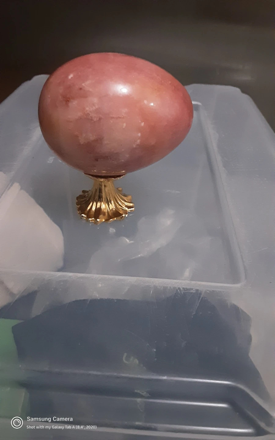 This is a natural rose quartz egg, approximately 3 "in size. It's a beautiful pink colour and comes with a decorative gold stand. Perfect for display or meditative practices!