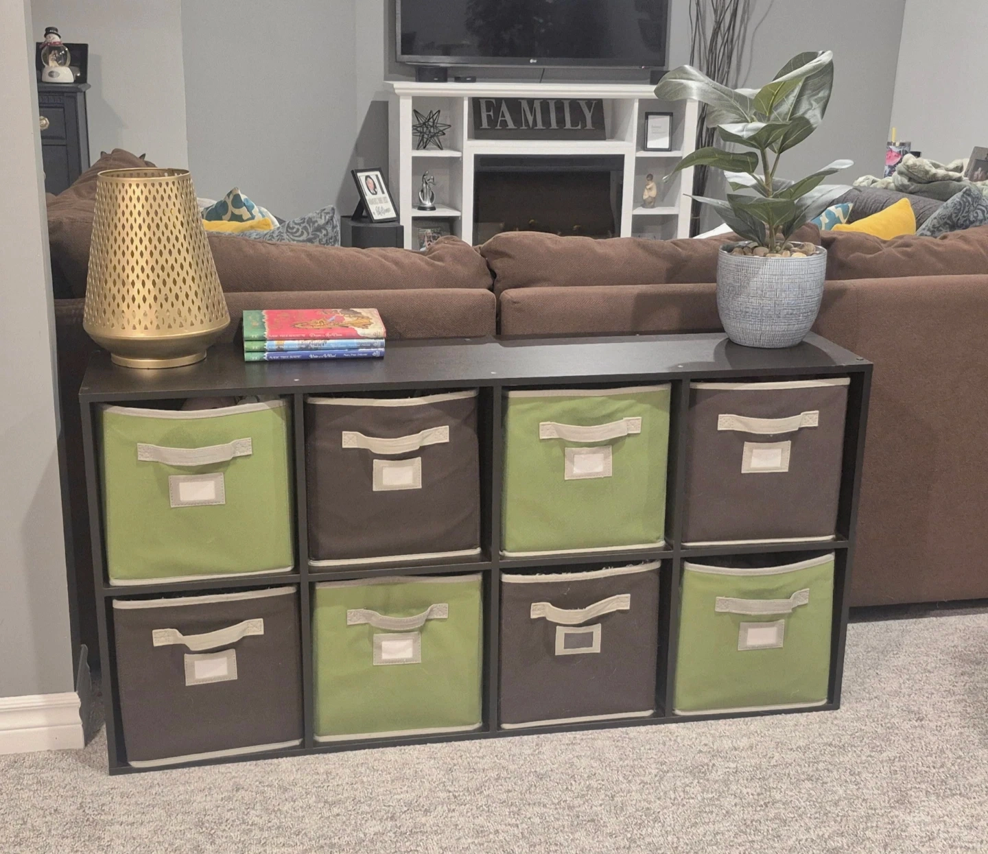 This storage cube organizer comes with eight fabric bins, four in a light green and four in a dark brown. It's a great way to keep your living space tidy. The bins have pull tabs for easy access. Perfect for organizing toys, books, or other household items.
