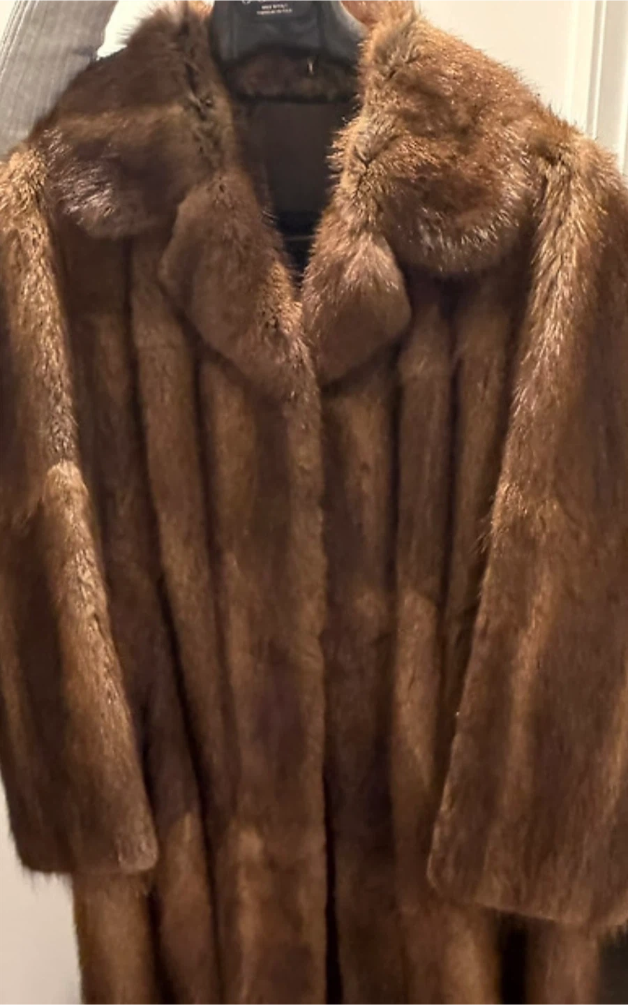 Luxurious brown mink fur coat with a classic collar. This elegant outerwear is made from genuine mink fur. It's a stylish choice for keeping warm.