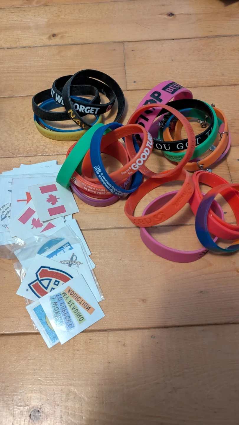 A collection of colourful silicone wristbands and various temporary tattoos,, including Canadian flag designs. Some wristbands have motivational or event-related text printed on them. The stickers also feature different graphics and slogans.