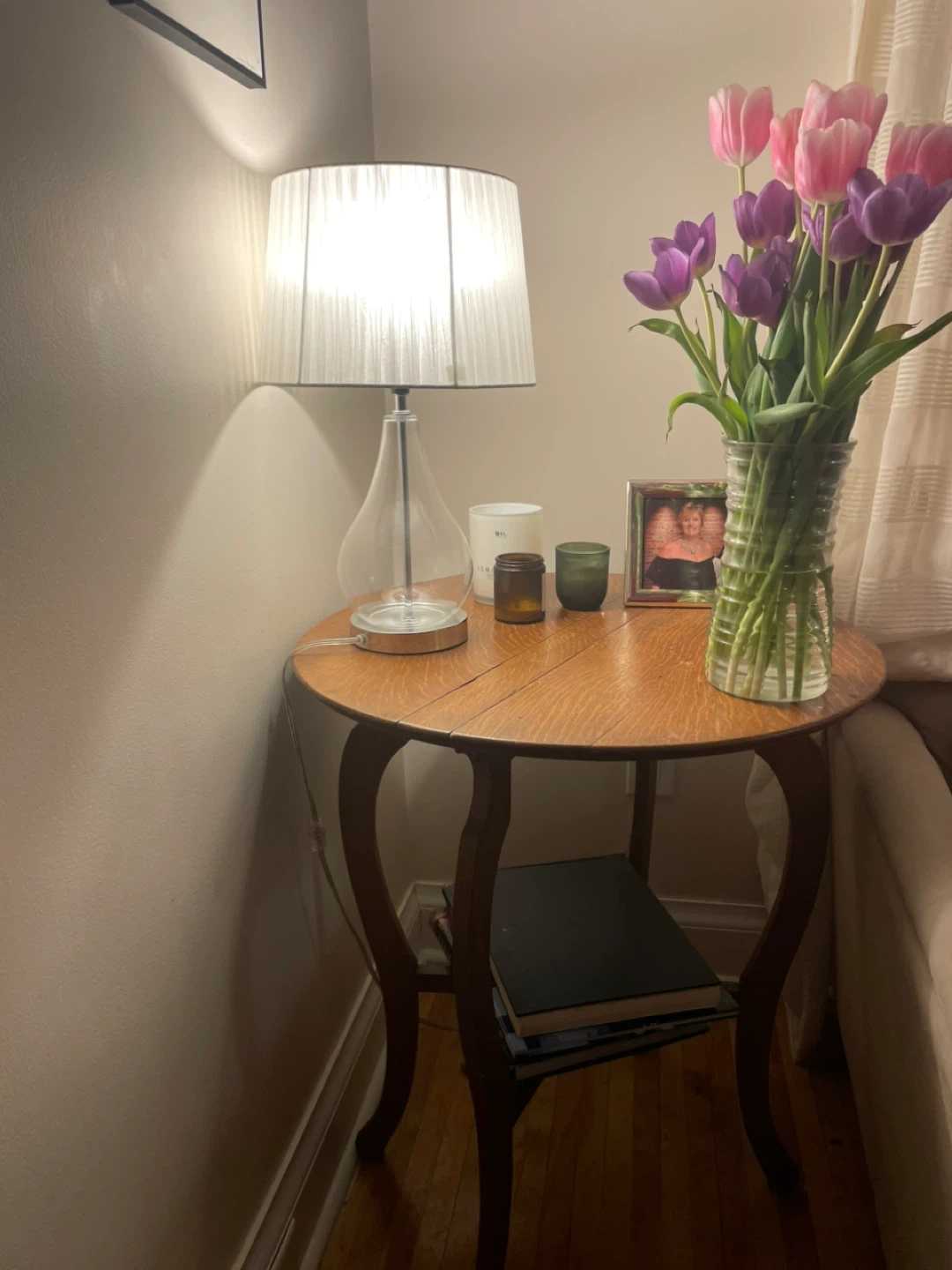 This is a charming vintage accent table made of wood. It features a drop-leaf design and curved legs, adding a touch of classic style to any room. A lower shelf offers extra storage space for books or decor. It's perfect for smaller spaces or as an entryway table!