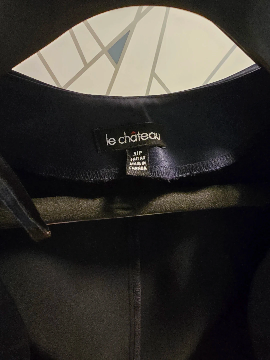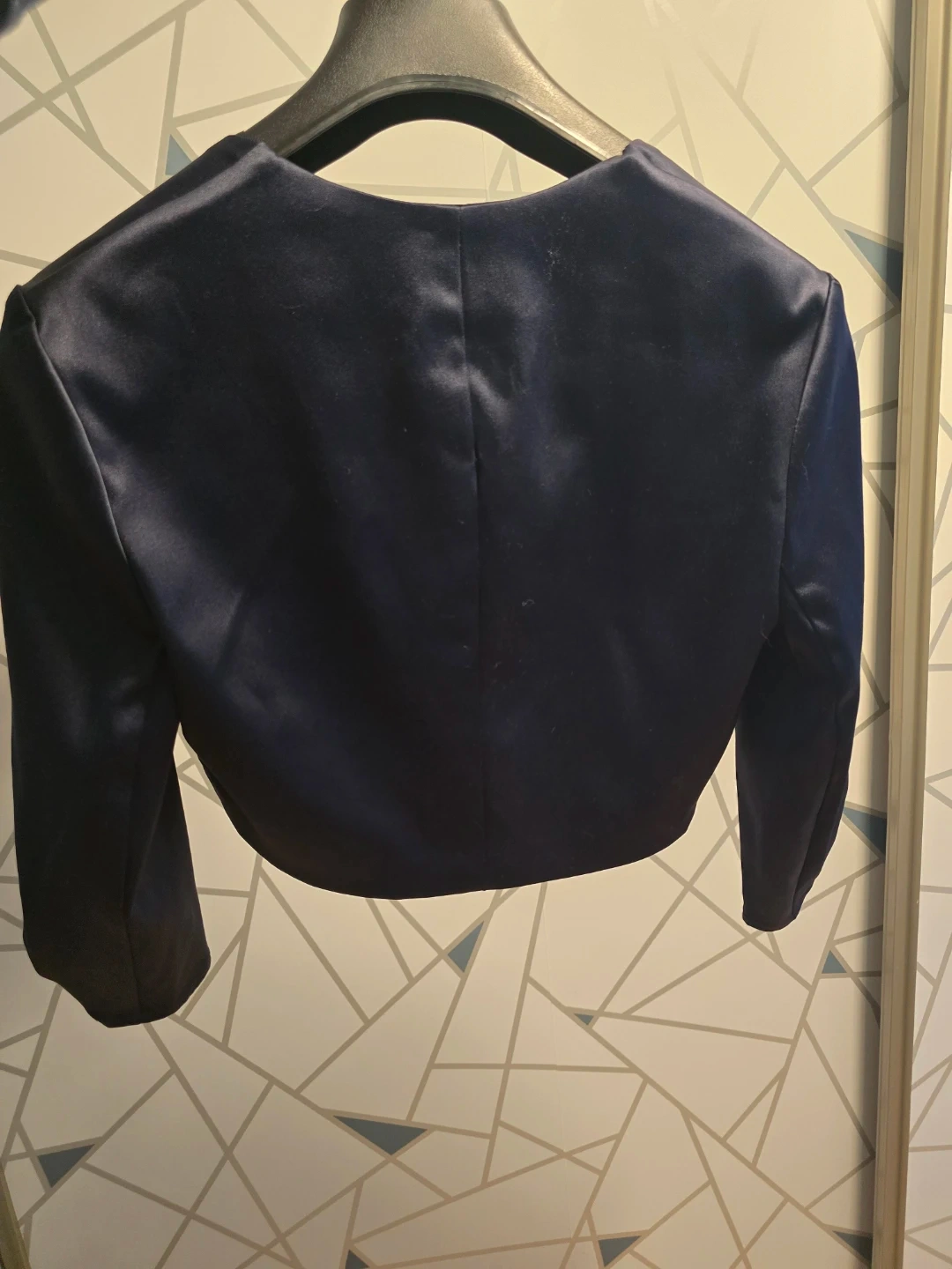 This is a Le Chateau navy blue satin bolero jacket. It's made of 97% polyester and 3% spandex. The jacket is size S/P and was made in Canada. Great addition for formal dresses/jumpsuits.