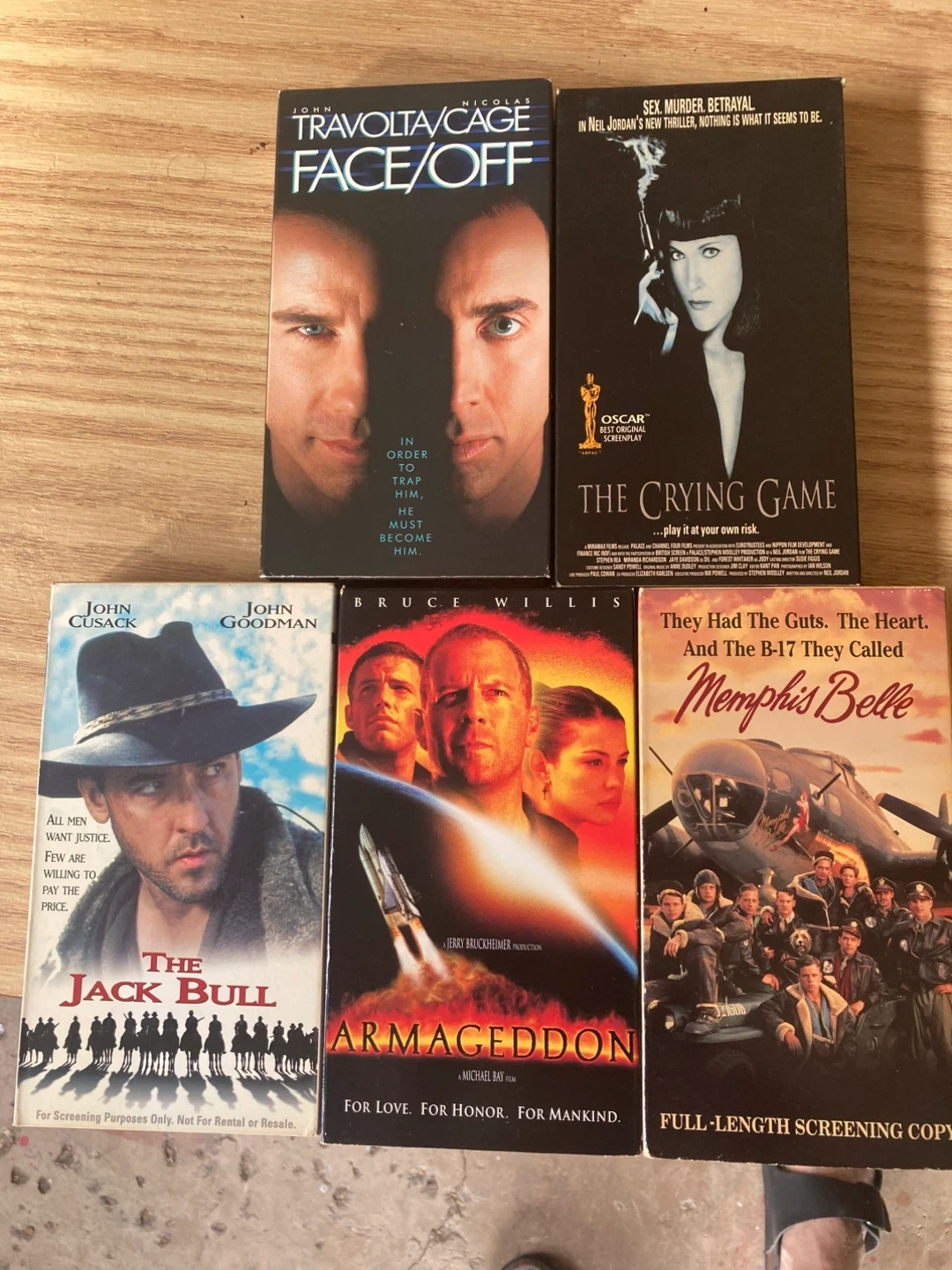 Selling a collection of VHS tapes! Includes: - The Jack Bull - Armageddon - Face/Off - The Crying Game - Memphis Belle Perfect for collectors or anyone looking for a bit of nostalgia