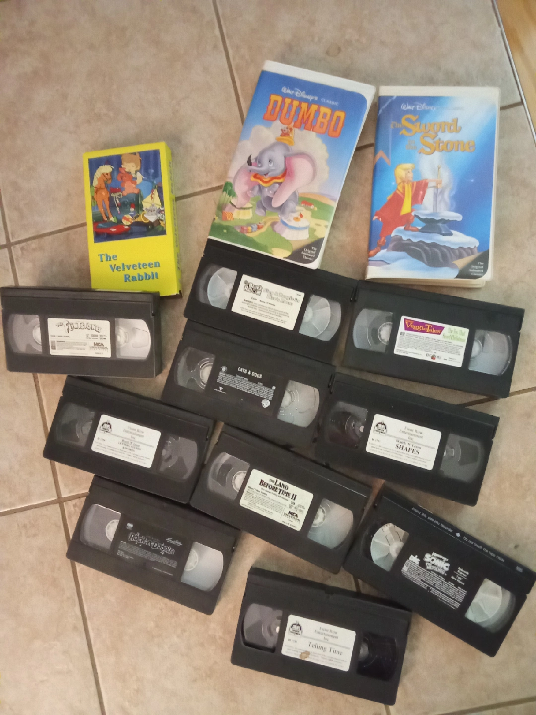Selling a collection of VHS tapes including Disney classics like Dumbo and The Sword in the Stone, as well as VeggieTales and other family-friendly movies like The Velveteen Rabbit, Cats & Dogs, The Land Before Time II, Rock-A-Doodle, Sonic Underground, Telling Time, and Warren Miller's Shapes