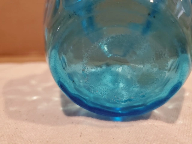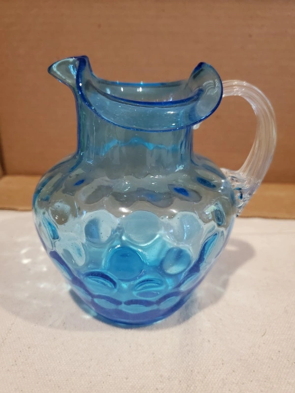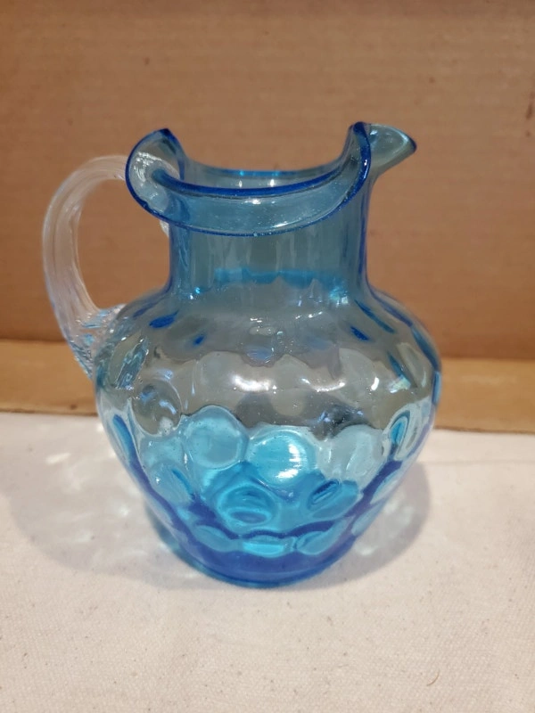 A nice little blue art glass jug/pitcher. It's about the size of a creamer. It's handblown glass in a vibrant blue, with a clear glass handle. The body is dimpled and it stands about 4.5" tall, without cracks or chips. $10.00, pick up only.