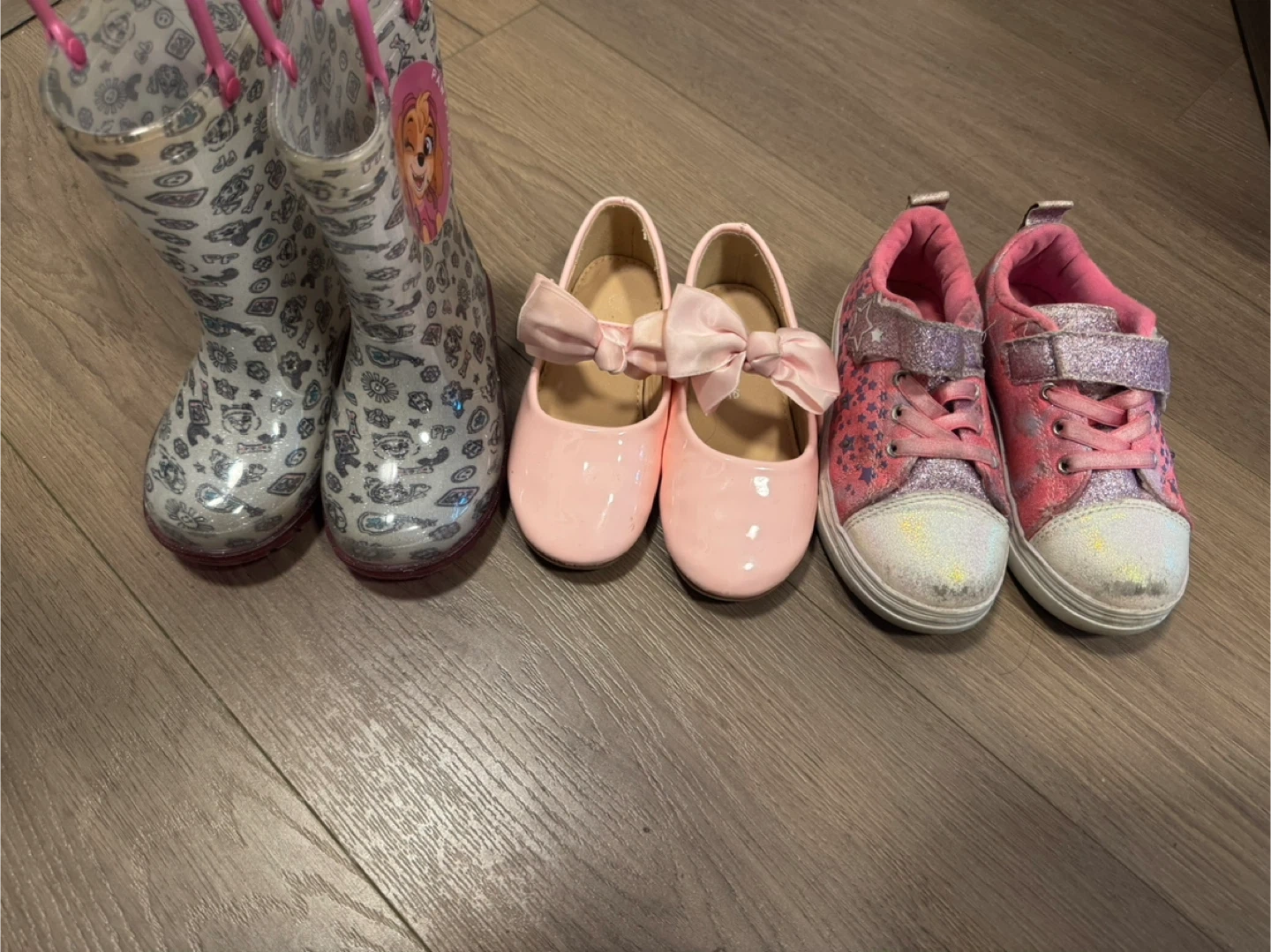 There are Paw Patrol rain boots, pink patent flats with bows, and pink sparkly sneakers with hook-and-loop closures. Sizes 9C