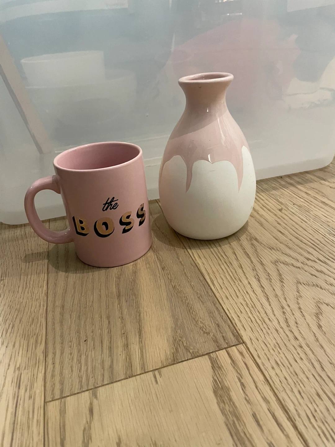 This pink mug features "the BOSS" text in gold lettering. It's paired with a pink and white drip glaze vase. Both are ceramic and would make a nice desk accessory!