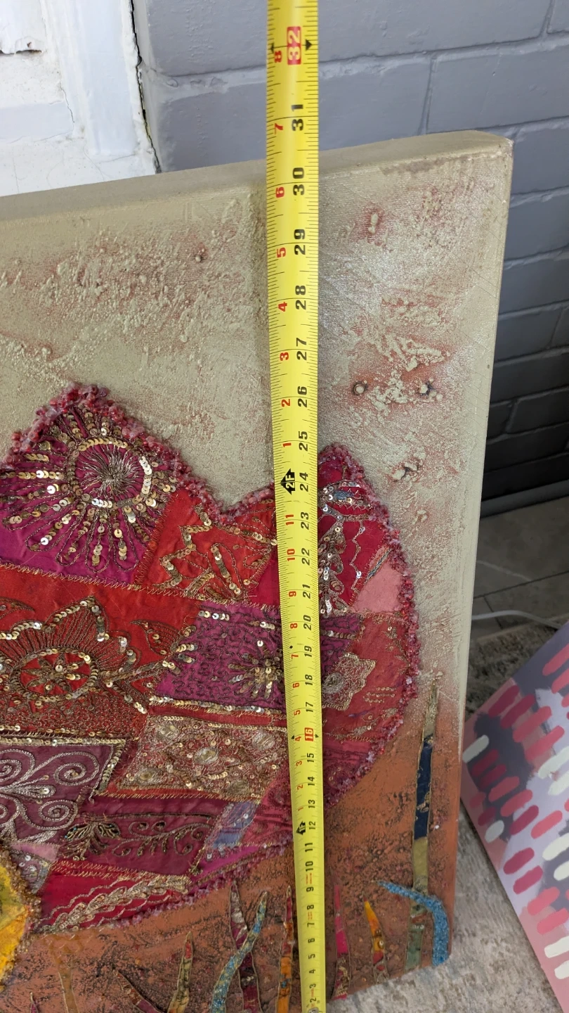 Textured fabric wall art featuring a vibrant floral design. It's approximately 30 x 60 inches. This unique piece adds a pop of colour and texture to any room!
