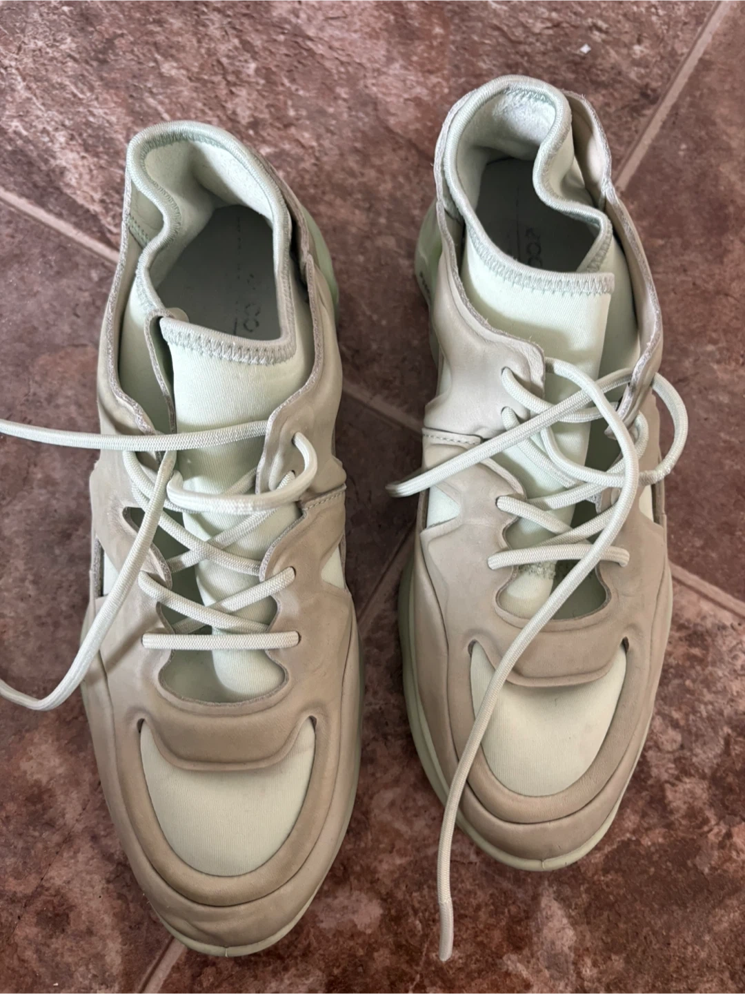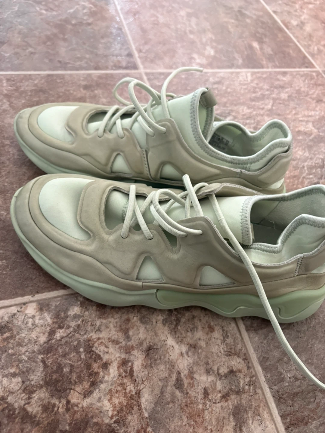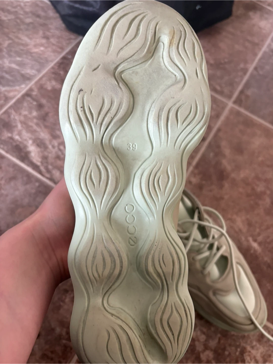 These ECCO Soft 7 ladies sneakers are a size 39. They're made with a light beige and mint green colour scheme. The unique sole design offers good traction.