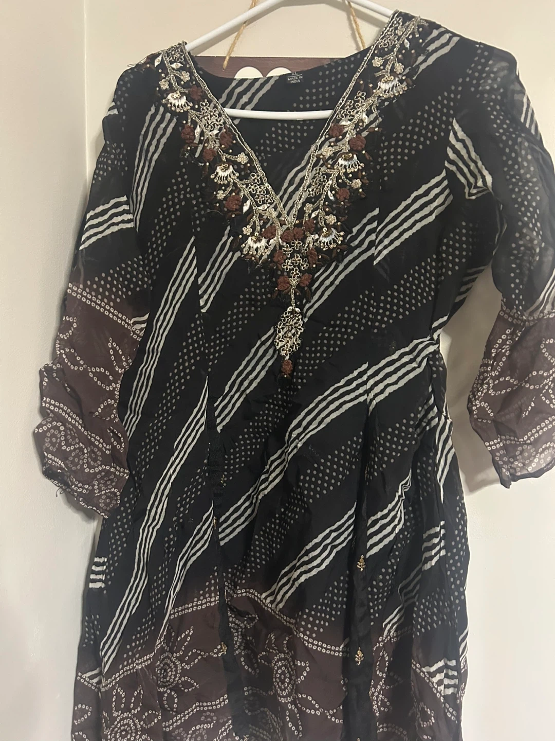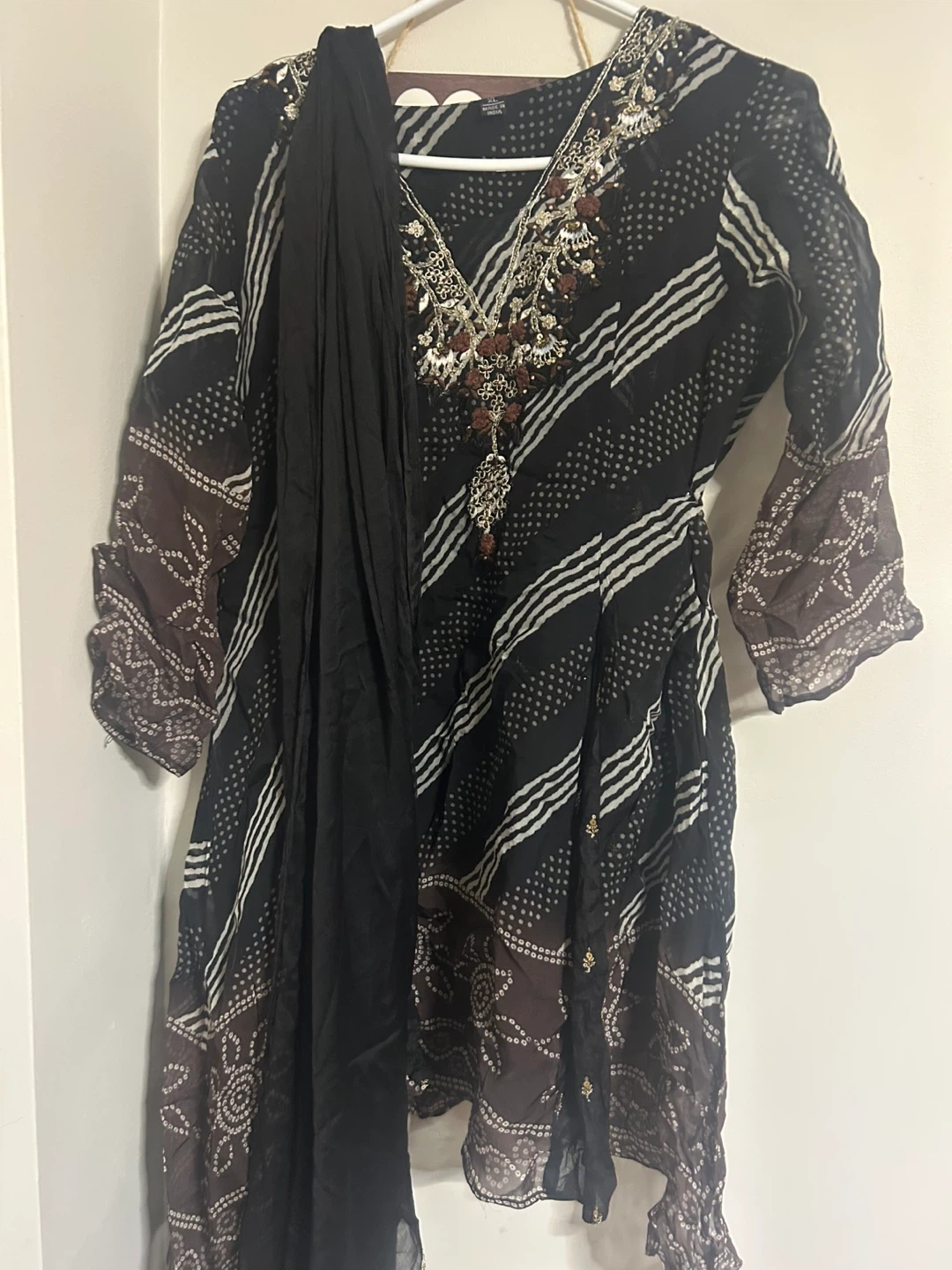This is a black embroidered kurti with a matching dupatta and Dhoti salwar with lace. The kurti features a V-neckline with intricate beadwork and sequin embellishments. It has a striped and dotted print pattern. The sleeves are flared with a patterned cuff. A plain black dupatta is also included.