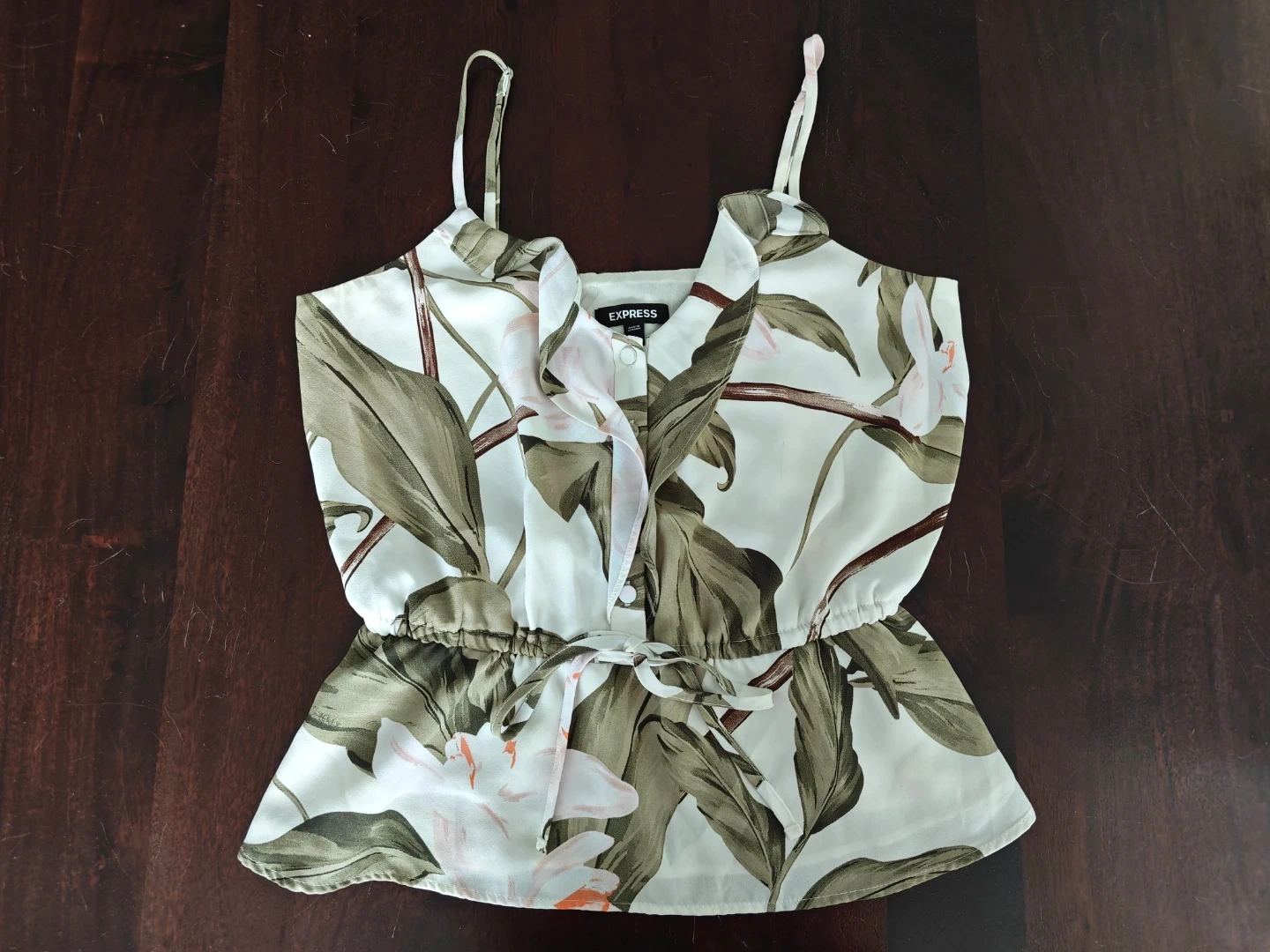 Cami top features a white background with a bold floral print. It has adjustable spaghetti straps and a ruffled neckline. The cinched waist with a tie detail adds a flattering silhouette.