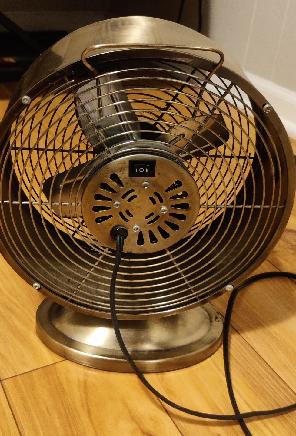 This is a vintage-style desk fan with a metallic brass finish. It features a sturdy base and a safety grille. A simple on/off switch controls its operation. It's great for circulating air in a small space!