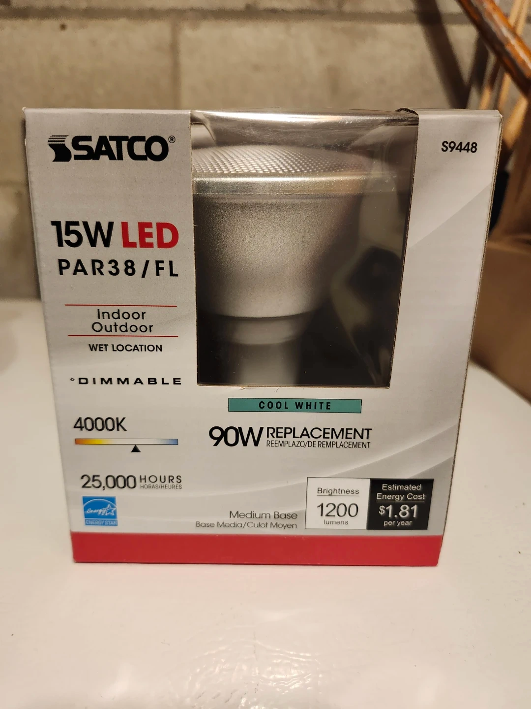 This Satco 15W LED PAR38/FL bulb offers cool white light and is dimmable. It's suitable for indoor and outdoor wet locations and has a medium base. The bulb provides 1200 lumens and has a lifespan of 25,000 hours. It's a 90W replacement, designed for an estimated energy cost of $1.81 per year.