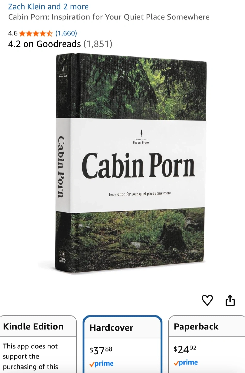 This is the hardcover edition of 'Cabin Porn: Inspiration for Your Quiet Place Somewhere'. It's collected by Beaver Brook and published by Little, Brown. Brand New. No damage- got 2 as gifts so don’t need this one.