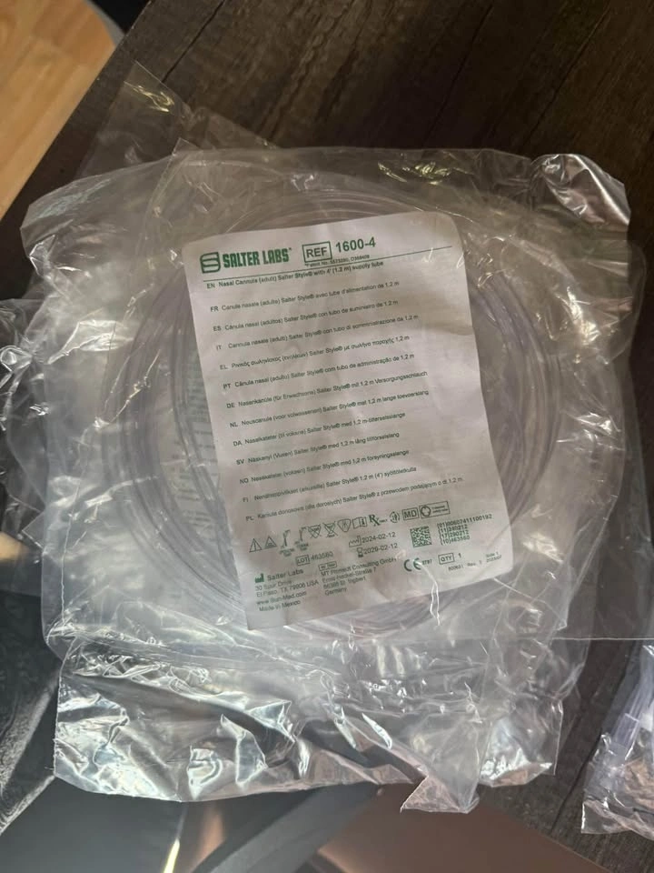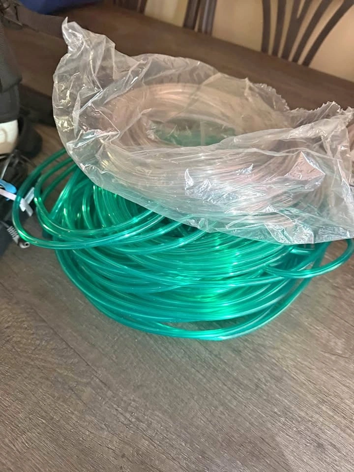 14 feet (4.2 meters) of oxygen tubing with Star Lumen design to resist kinking. Standard connectors on both ends. Includes T-shaped tubing connectors. Also includes 8x 4' cannulas, 4x 7' cannulas, and 1x 2' cannula. Cannulas have soft, curved nasal prongs and 3-channel, kink-resistant tubing, suitable for low to medium oxygen flow. All items are new and never used.