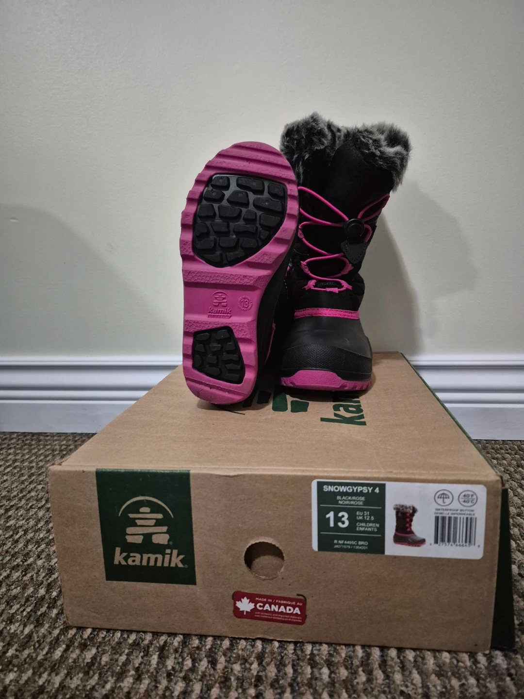 Selling a pair of Kamik Snow Gypsy 4 boots in black and rose! They're in great condition and perfect for keeping little feet warm and dry this winter. Size 13