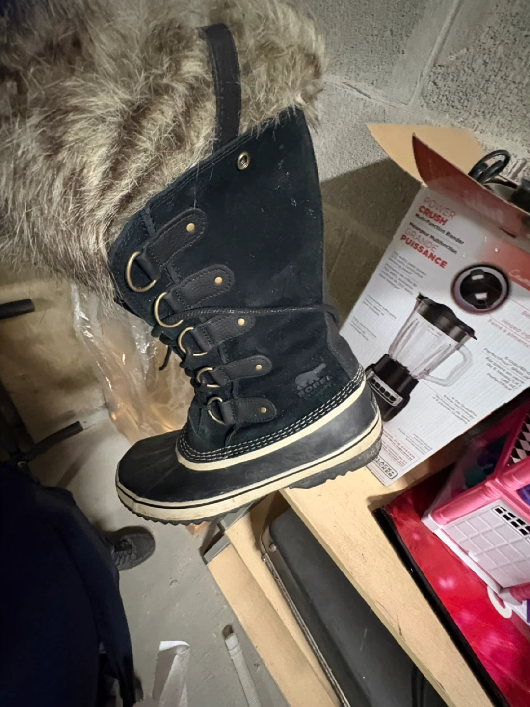 Sorel winter boots in black suede with a faux fur trim. Women's size 12 (US), 10 (UK), 43 (EUR). These boots are made in China. They feature a lace-up front and a durable rubber sole. Great for keeping your feet warm in the snow!