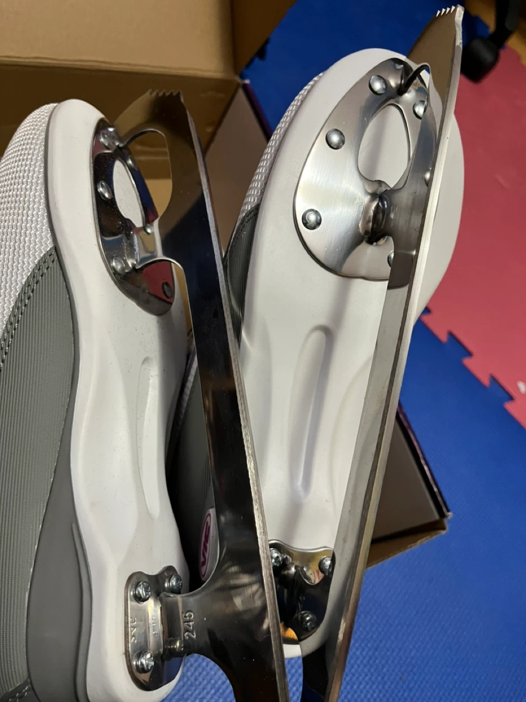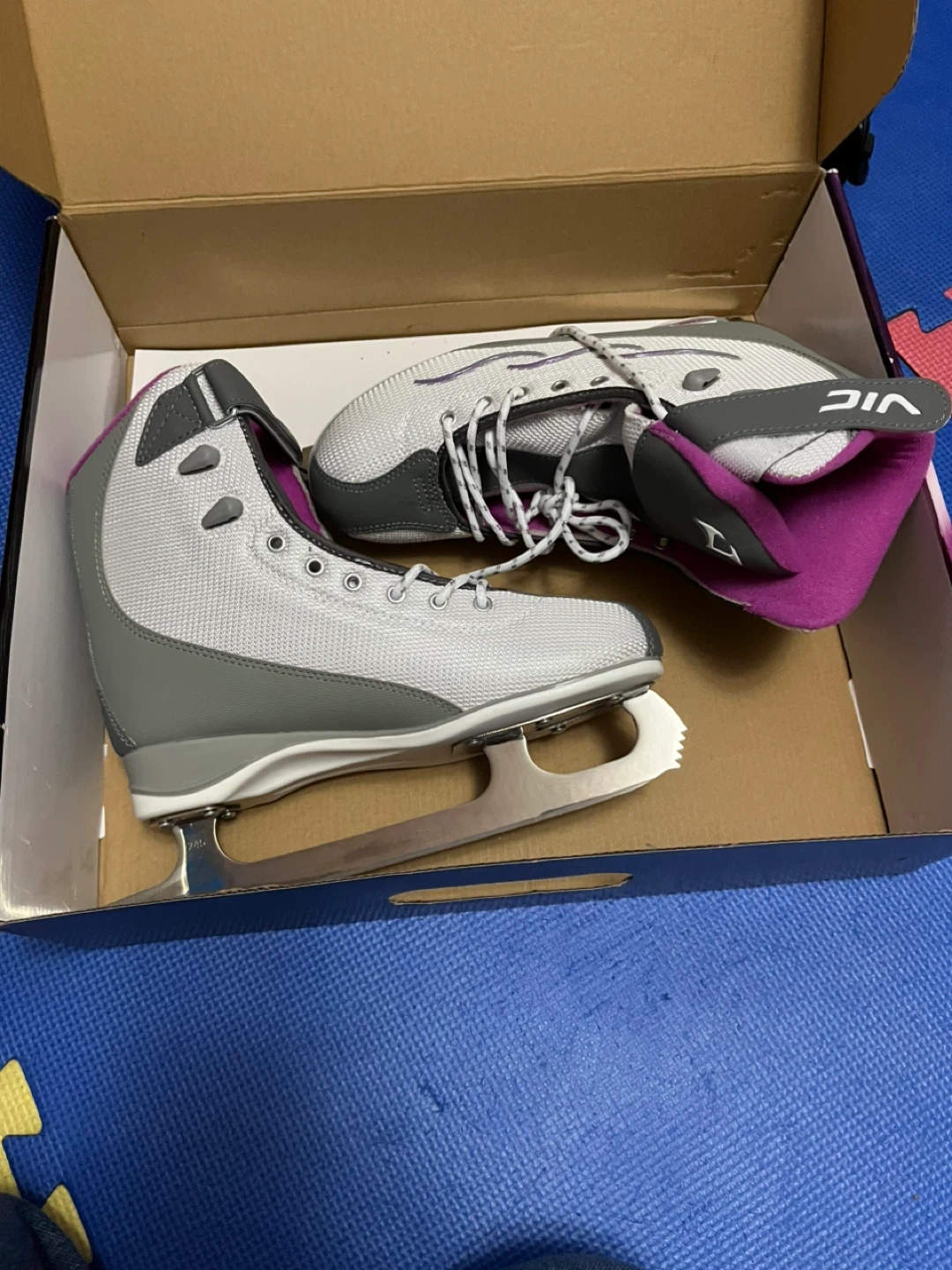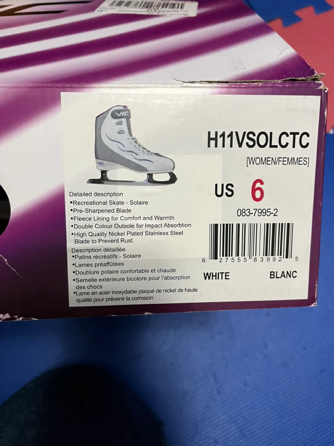 12Selling a pair of VIC figure skates for women, size US 6. These are the H11VSOLCTC model and come in white. They feature a pre-sharpened blade and fleece lining for extra comfort and warmth. The outsole is double coloured for impact absorption, and the blade is made of high-quality nickel-plated stainless steel to prevent rust. Comes with the original box