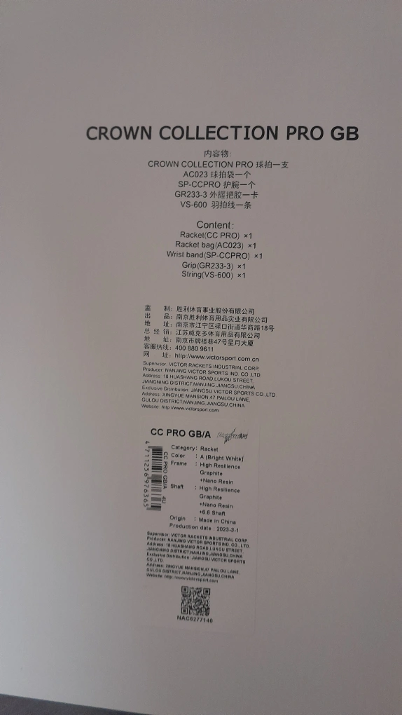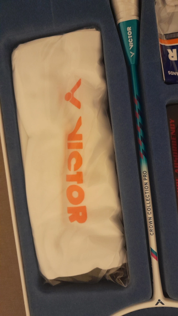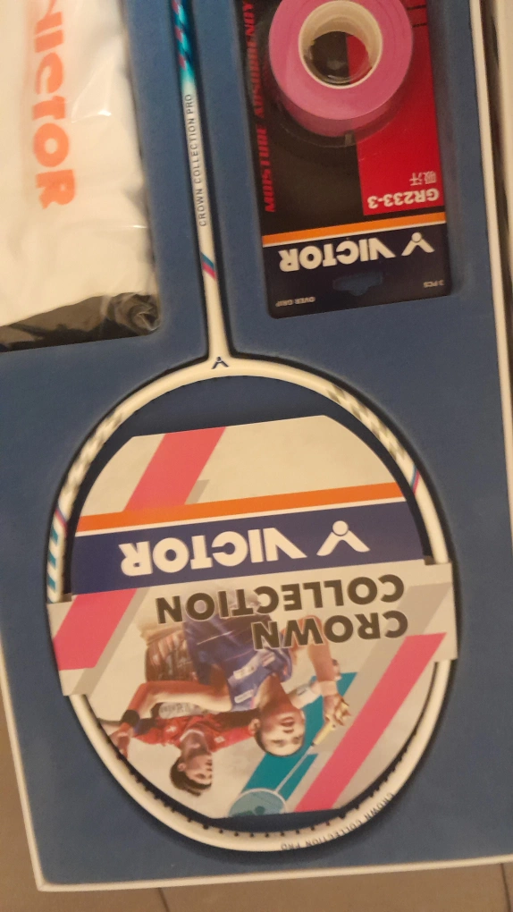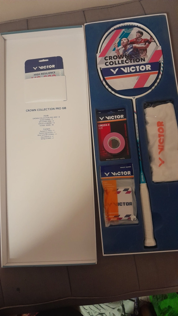 Selling a Victor Crown Collection Pro GB badminton set. Includes: - Racket (CC PRO) x 1 - Racket bag (AC023) x 1 - Wrist band (SP-CCPRO) x 1 - Grip (GR233-3) x 1 - String (VS-600) x 1 Comes in the original box