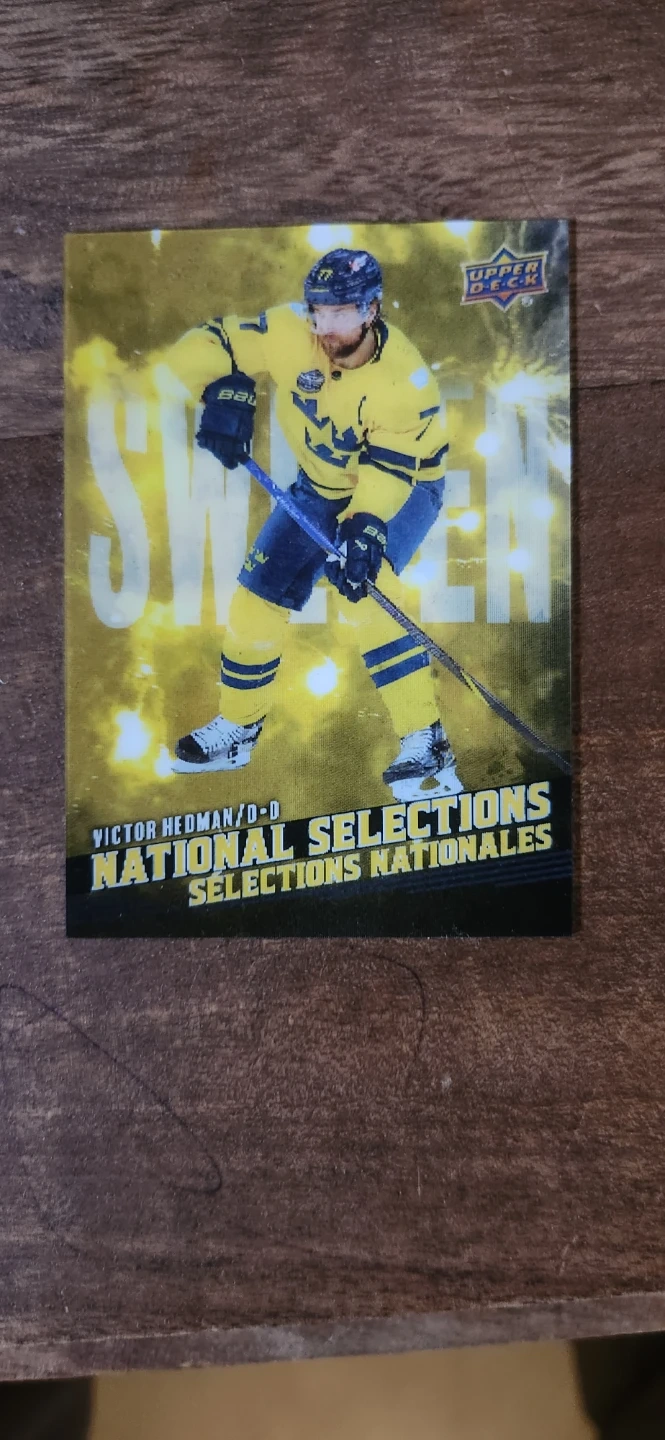 10Selling a Victor Hedman D/D National Selections hockey card from Upper Deck. It's from the 2023-2024 Tim Hortons Collectable Series. The card commemorates Hedman setting up Sweden's first goal of the 4 Nations face-off against Canada on Feb 12, 2025