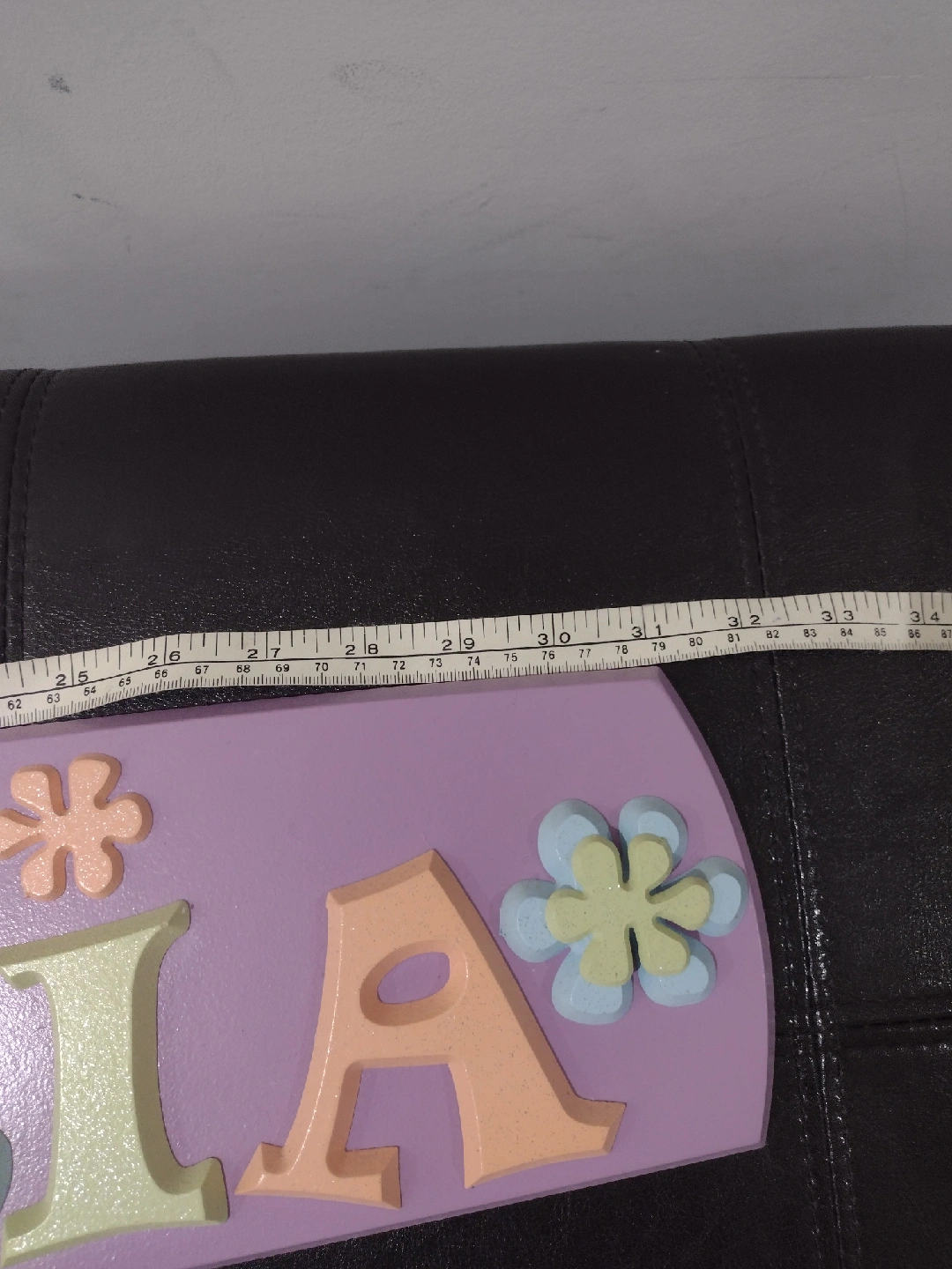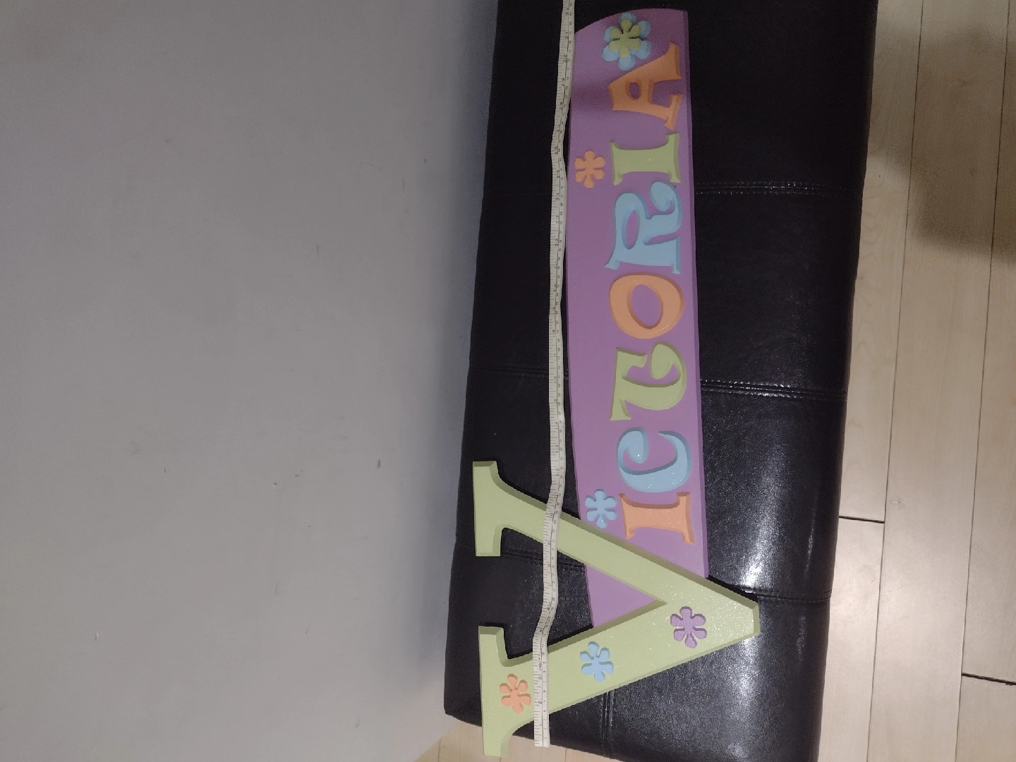 10Cute 'Victoria' name sign for wall decor! The sign is made of wood and features pastel colours and flower accents. The base is lavender, and the letters are in various colours. The whole sign measures approximately 34 inches in length