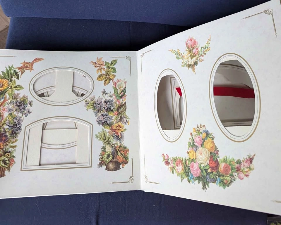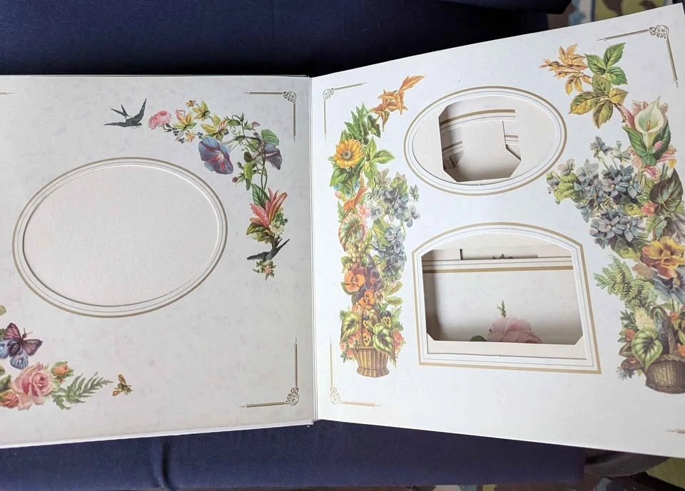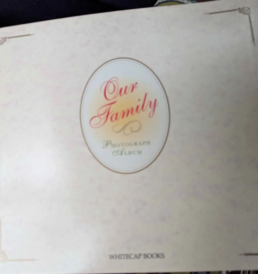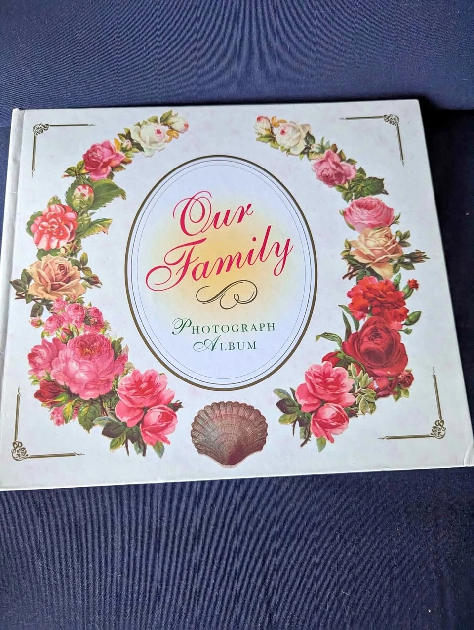 10"Our Family" vintage photo album with flowers, birds and butterflies. Will fit up to 37 photographs of different sizes. It has an attached red ribbon that allows for a nice bow. It measures 9 3/8" long and 10.5" wide. The album has never been used. It will provide a beautiful, heirloom family album. North St Catharines pickup, cash only