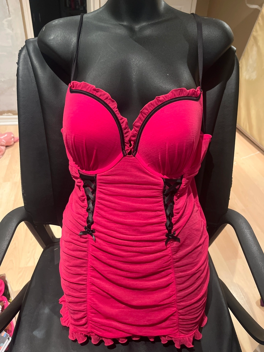 Selling a cute Victoria's Secret lingerie piece in a lovely pink colour! It's a size L and features a flattering design with black accents. Perfect for adding a little something special to your wardrobe excellent news condition shipping avalible more items 15.00 flat with tracking no gas money and deceit