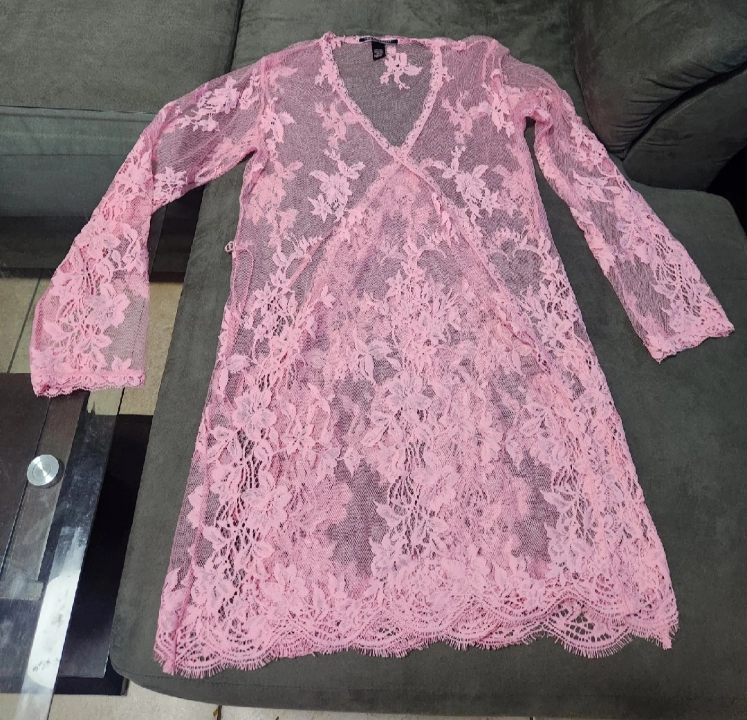 Selling a Victoria's Secret pink lace cover up in size XS. It's in great condition and perfect for layering or wearing as a beach cover-up! The delicate lace detailing adds a touch of elegance