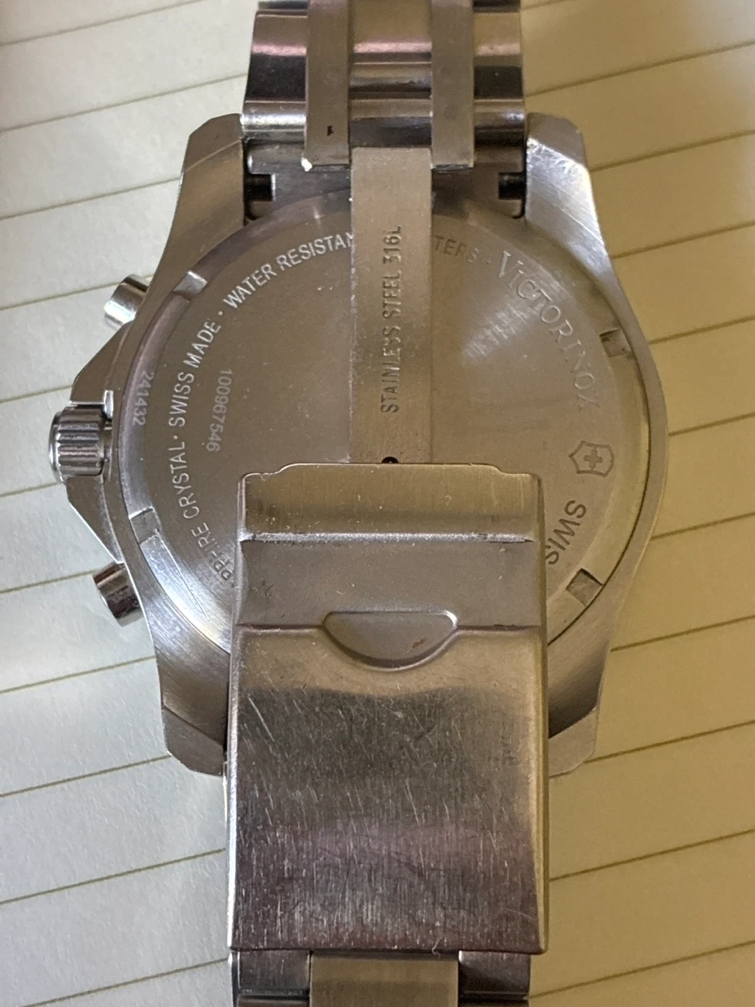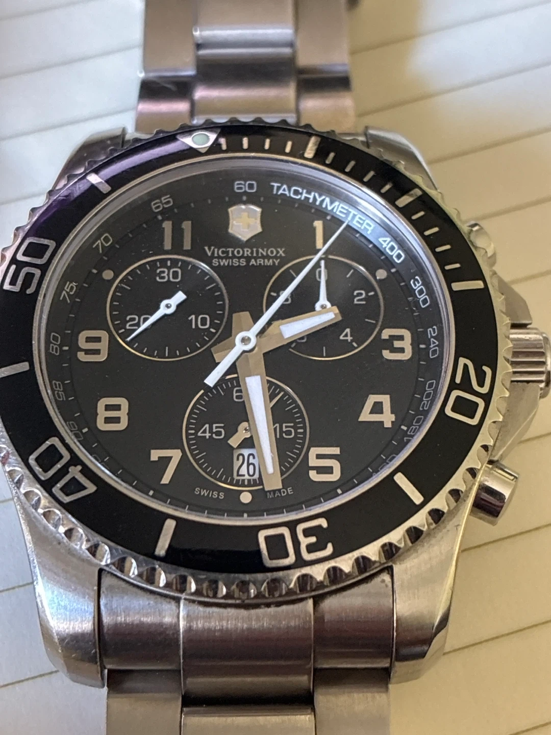Selling a Victorinox Swiss Army watch. It features a black dial with chronograph subdials and a tachymeter bezel. The watch is stainless steel 316L. Swiss made.comes with extra links
