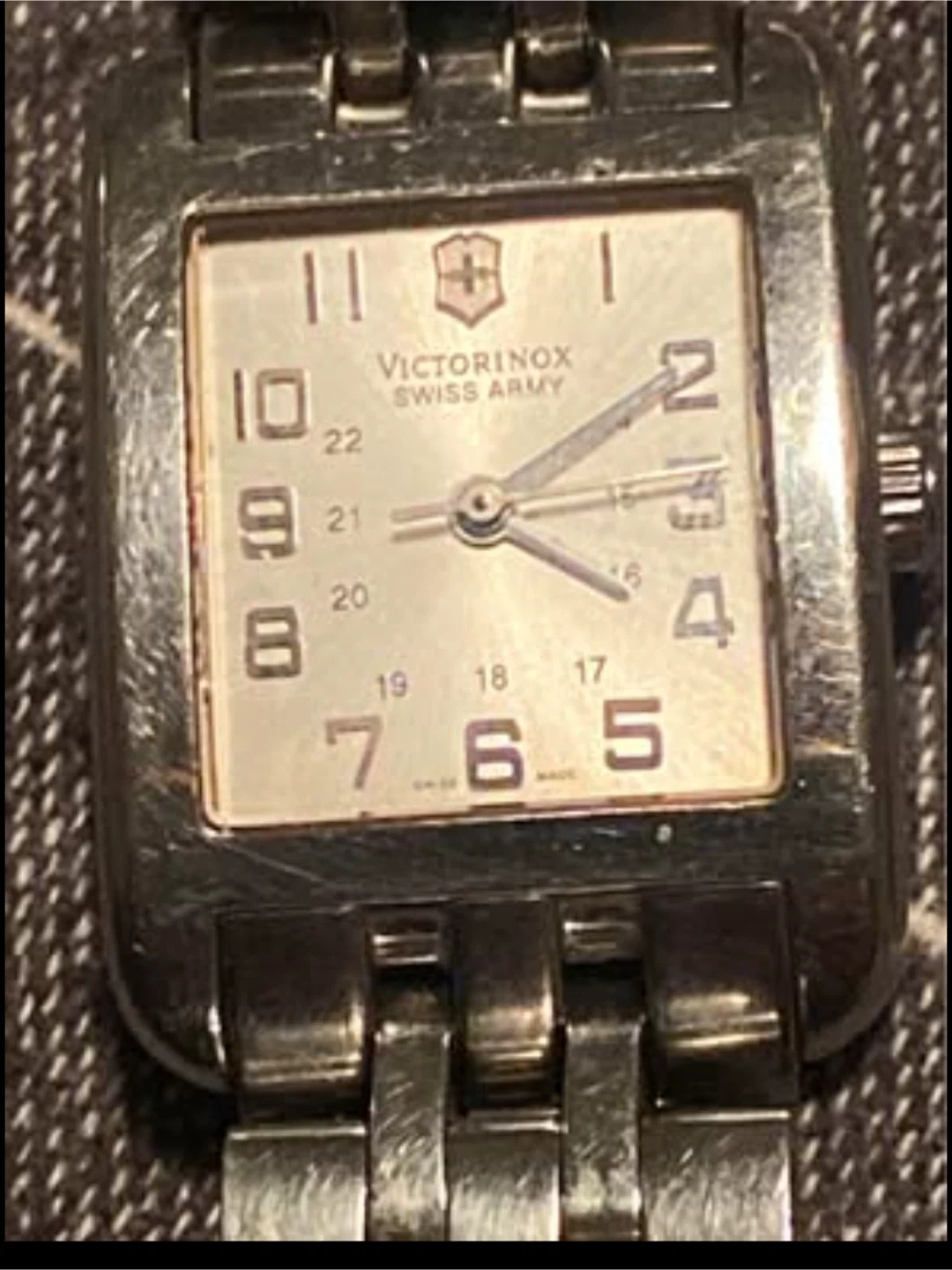 65Selling a Victorinox Swiss Army women's watch. It has a square face with a metal band. There are some signs of wear on the band and face, but it's still a stylish timepiece!