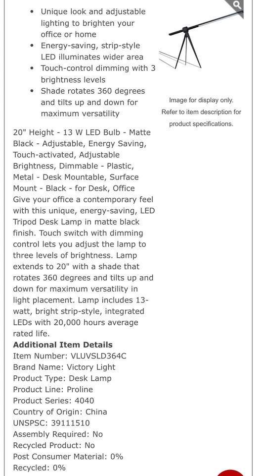 Victory Light LED Tripod Desk Lamp 20" Height - 13 W LED Bulb - Matte Black - Adjustable, Energy Saving, Touch-activated, Adjustable Brightness, Dimmable - Plastic, Metal - Desk Mountable, Surface Mount - Black - for Desk, Office Part Number: VLUVSLD364C 2 available Pick up in Brighton