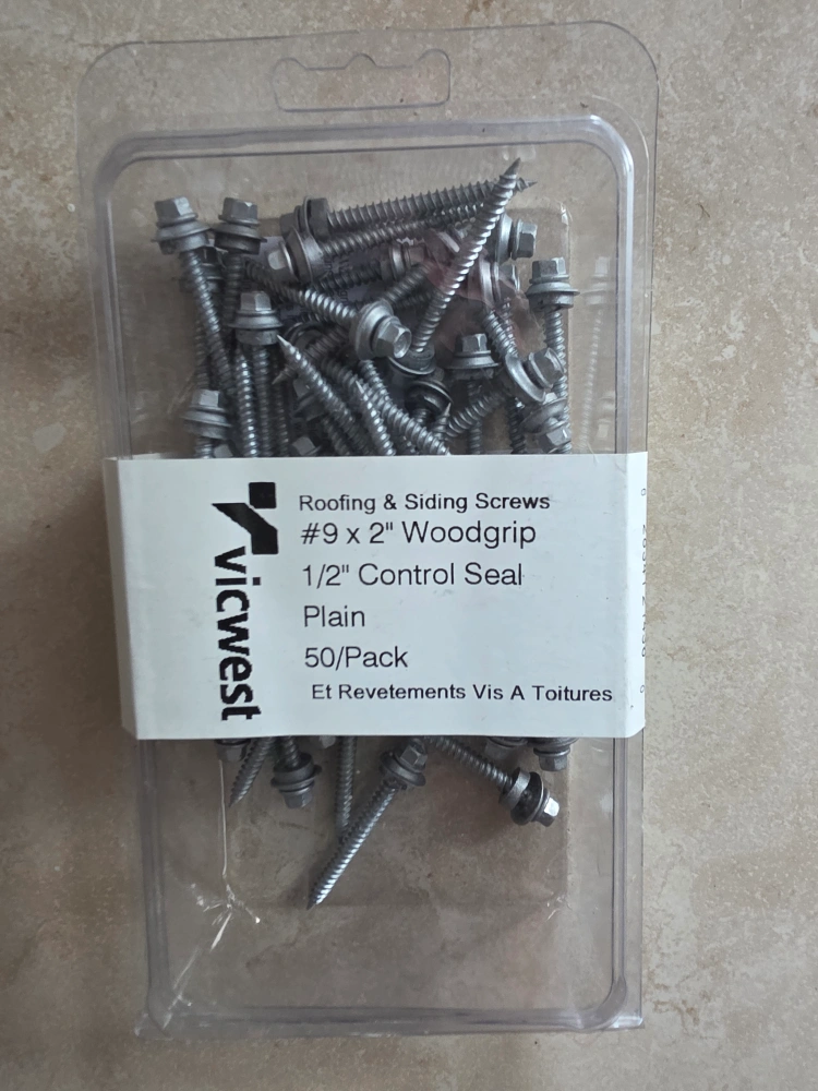Selling a pack of Vicwest roofing and siding screws. These are #9 x 2" Woodgrip screws with a 1/2" Control Seal. The pack is plain and contains 50 screws. 3 Packs available.