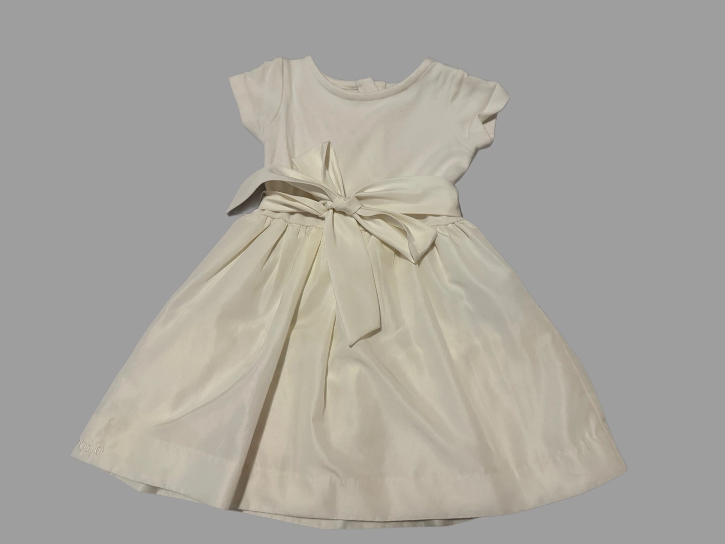This is a sweet Ralph Lauren dress for girls in an ivory colour! It features a cute bow at the waist. Perfect for a special occasion or just looking extra fancy!