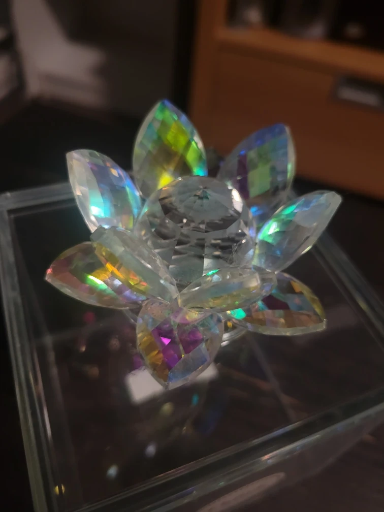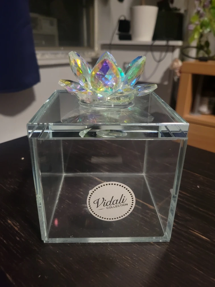 130Selling a lovely glass box from the Vidali Collection! It has a beautiful crystal lotus on top that catches the light wonderfully. It's in great condition with no scratches.
