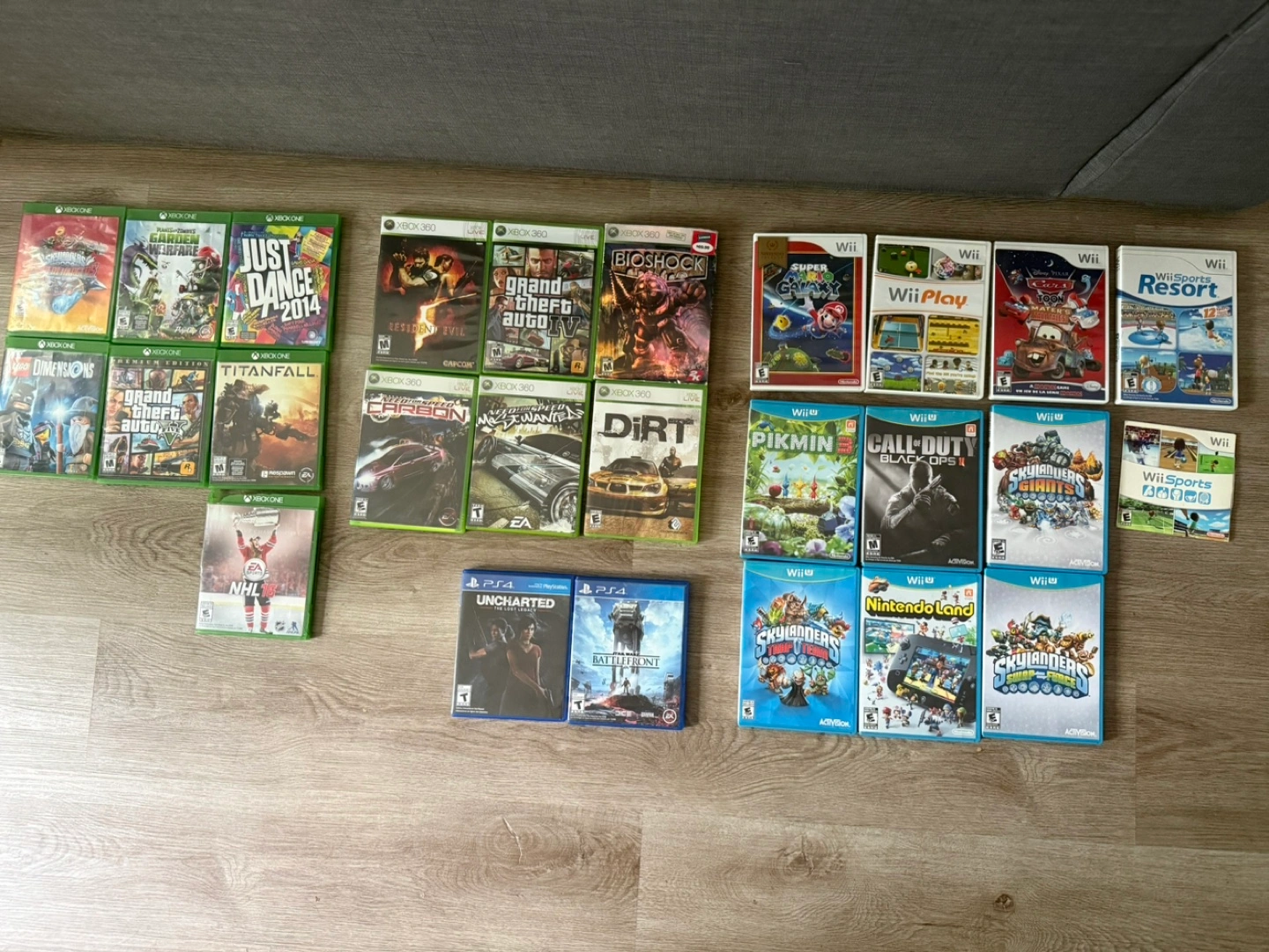 Selling a variety of video games for different consoles including Wii, Wii U, Xbox 360, and PS4. All games are in good condition and ready for a new home! Check out the photos to see the available titles. Xbox one Titanfall 5.00 Nhl16-5.00 Just dance 2014-5.00 Plants vs zombies 5.00 GTA v-30.00 Lego dimensions -20.00 Skylanders -60.00 Xbox 360 Resident evil 5-30.00 GTA iv-25.00 Bioshock-10.00 Need for speed carbon-20.00 Need for speed most wanted -60.00 Dirt-15.00 PlayStation 4 Drakes uncharted the lost legacy-20.00 Star Wars battlefront-15.00 Nintendo Wii U pikmin 3-20.00 Call of duty black ops 2-20.00 Nintendo land -15.00 Skylanders 20.00 each Nintendo Wii Super Mario galaxy -20.00 Cars toon maters tall tails -15.00 Wii sports resort-30.00 Wii sports -25.00