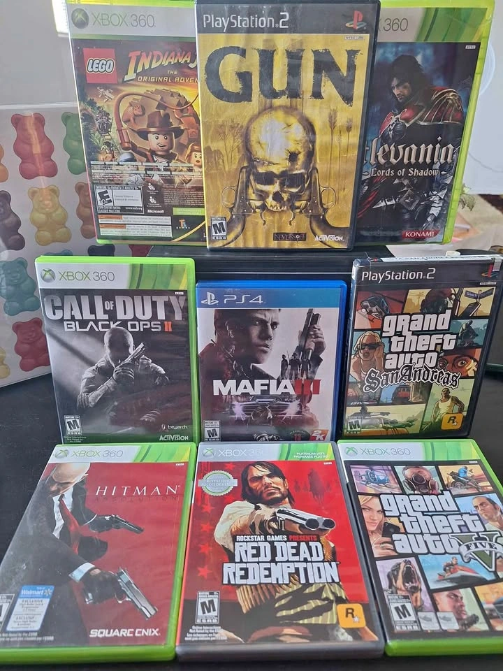 Mafia 3 - PS4 Grand Theft Auto 5 - Xbox 360 Grand Theft Auto San Andreas - PS2 Gun - PS2 Red Dead Redemption - Xbox 360 Lego Indiana Jones & Kung Fu Panda - Xbox 360 Castlevania - Xbox 360 Call Of Duty Black Ops 2 - Xbox 360 Hitman - Xbox 360 Pick up in Bradford. $5 each or all for $35