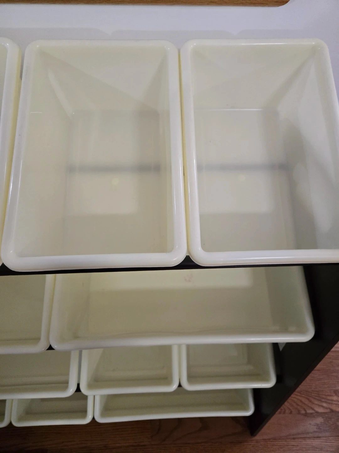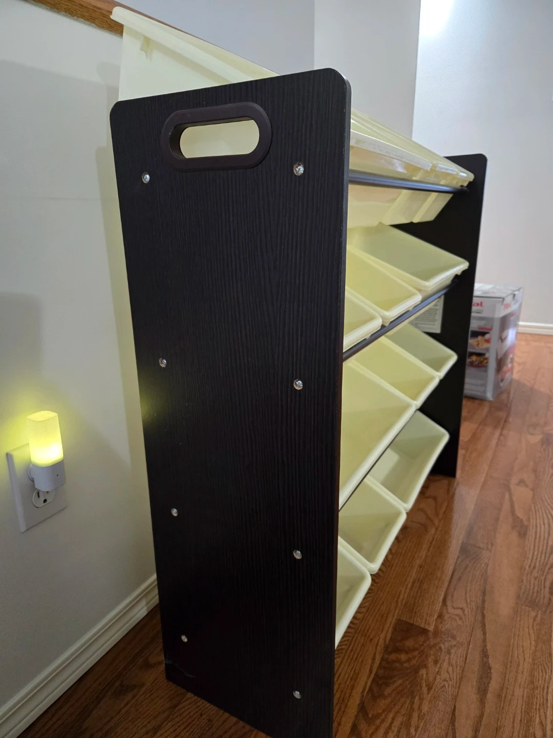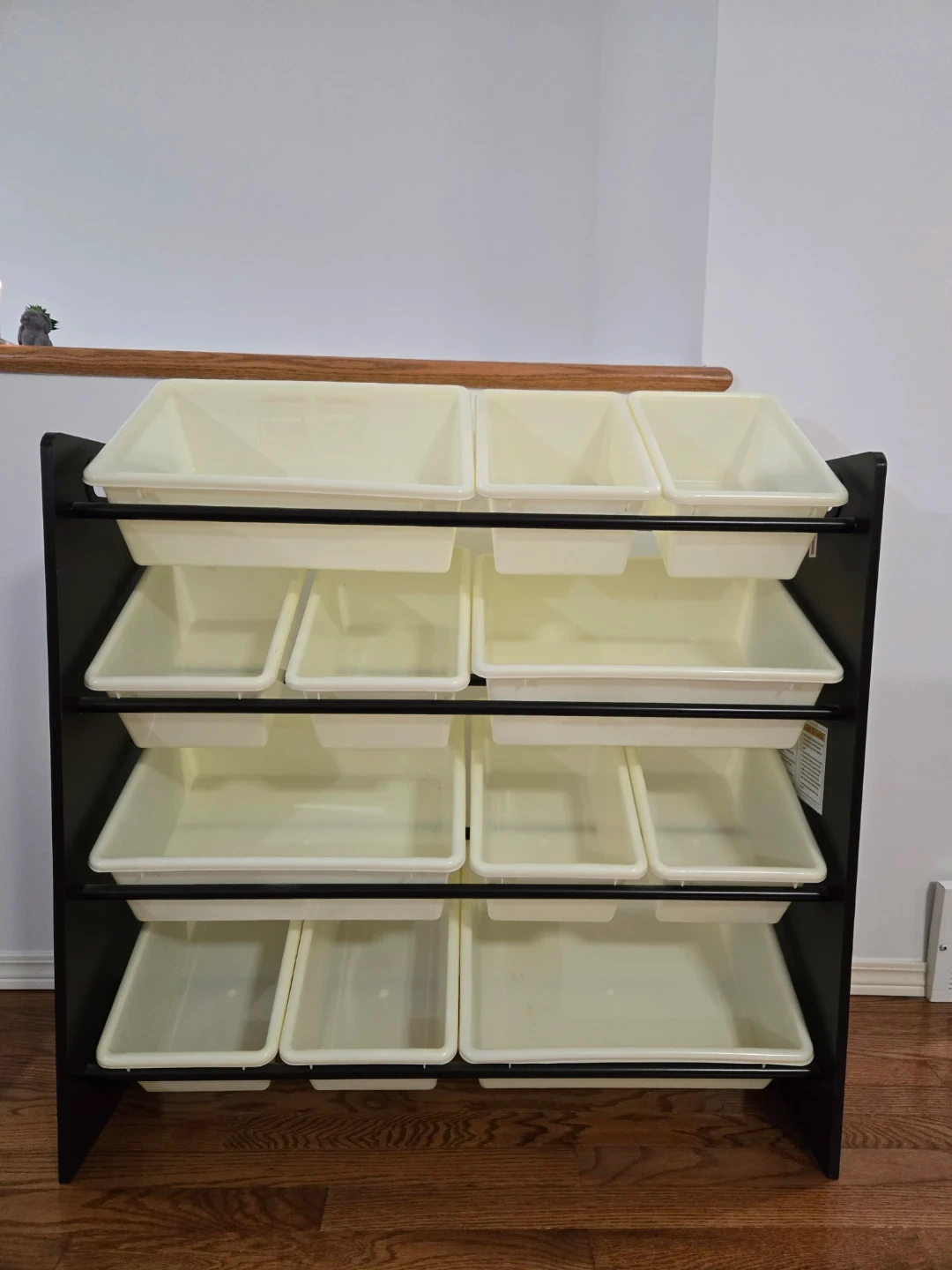 This organizer shelf comes with 12 plastic bins for storing toys and other items. It has a dark brown wooden frame and light-coloured bins. Great for keeping playrooms tidy!